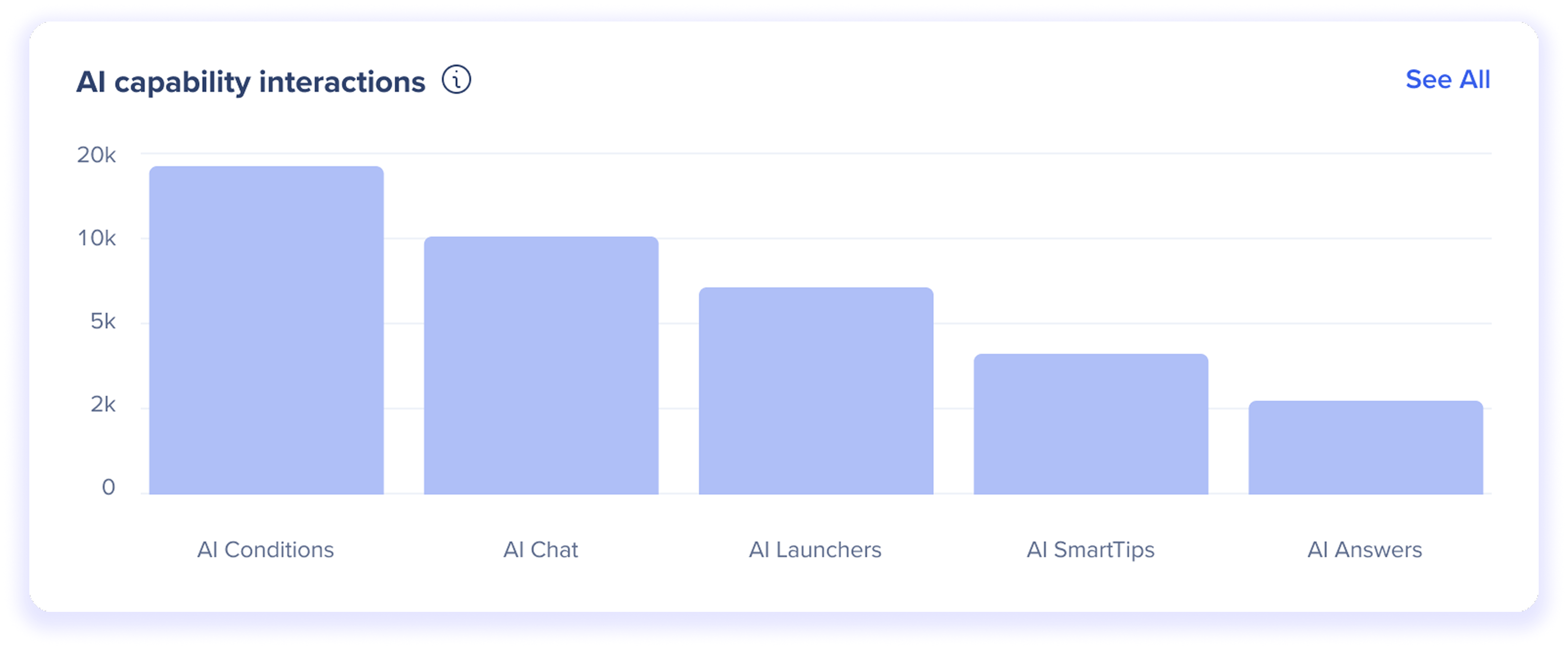 This widget shows usage volume by AI capability, helping you understand where AI is delivering value across the WalkMe experience.