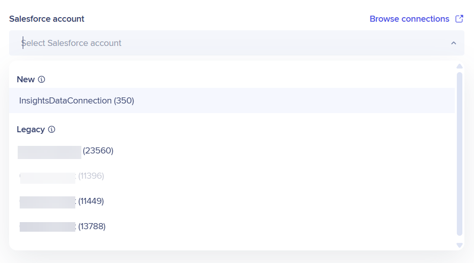 Select the Salesforce account you want to use to securely connect and deliver data to Salesforce. A dropdown gives you the option of legacy(old ) or new connection