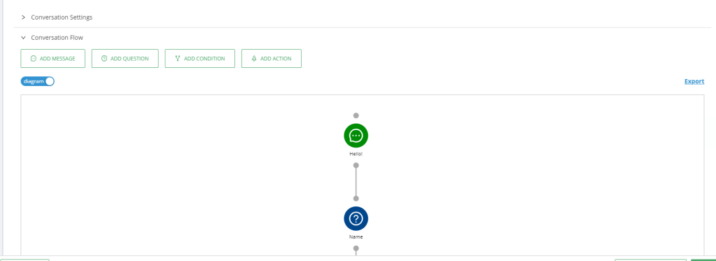 Durch die Aktivierung der Diagrammansicht erhalten Sie eine visuelle Darstellung Ihres ActionBot-Builds. Dann können Sie ein ActionBot-Gespräch als Diagramm (Ablauf) anzeigen, bearbeiten und exportieren.