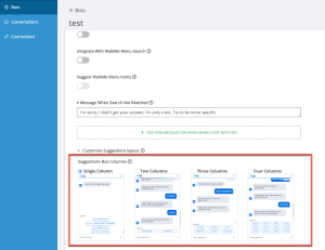 Customize Suggestions Layout (Vorschlags-Layout anpassen) – Sie können anpassen, wie die Liste vorgeschlagener Gespräche eines Bots Ihren Endbenutzern angezeigt wird. Dabei haben Sie die Auswahl unter den folgenden Optionen: