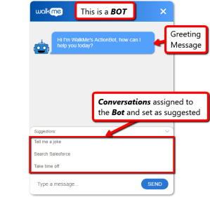 Ein WalkMe ActionBot ist eine Chat-Schnittstelle, mit der Endbenutzer interagieren, um Aufgaben zu erledigen und Fragen zu beantworten. Sie können den ActionBot mit einem Launcher auf jede Webanwendung platzieren. ActionBots, die im WalkMe Editor erstellt wurden, stellen fest, was der Benutzer erledigen muss, bzw. was er vorhat. Basierend auf diesen Informationen kann ein ActionBot das richtige Gespräch auswählen, das auch im WalkMe Editor erstellt wurde.