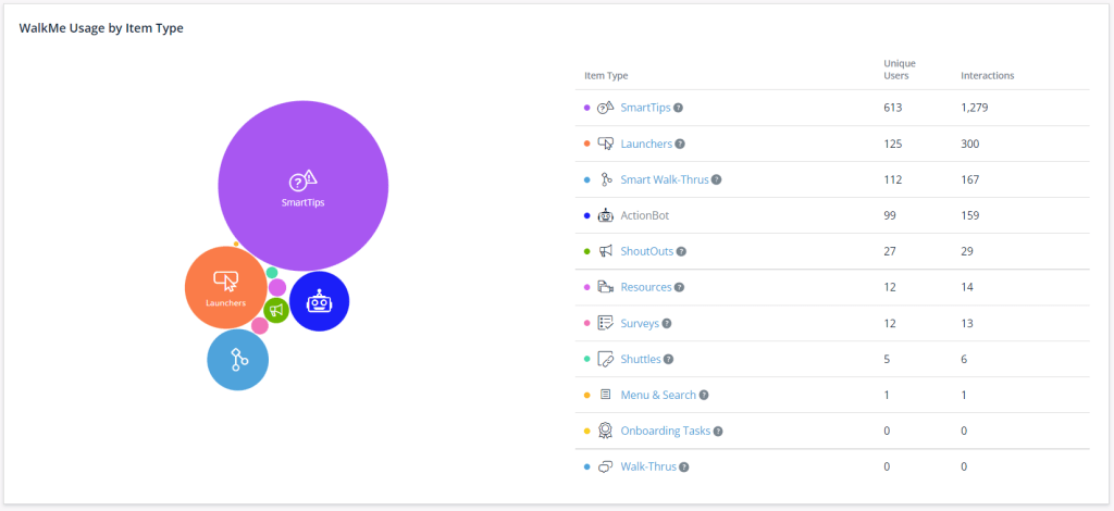 Diese Tabelle zeigt die fünf besten WalkMe-Elemente an, die nach der Anzahl der eindeutigen Benutzer gereiht wurden, die mit ihnen interagiert haben.