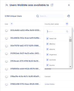 Um die vollständige Liste der Benutzer, für die WalkMe verfügbar war und der Benutzer, die mit WalkMe interagiert haben, zu sehen, können Sie auf die Nummer klicken und ein Seitenmenü wird geöffnet: