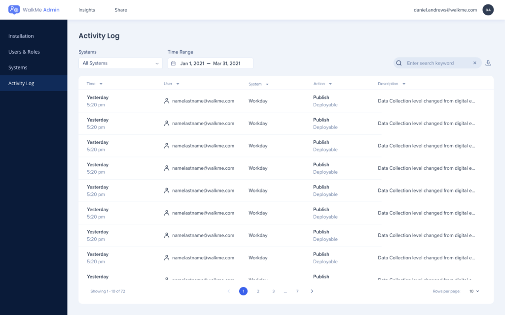 Das neu aktualisierte Aktivitätsprotokoll ist ein anwendungsübergreifendes Protokoll aller WalkMe-Ereignisse und bietet WalkMe-Administratoren ein zentrales Verwaltungssystem sowie verbesserte Sichtbarkeit für WalkMe-Aktivitäten.