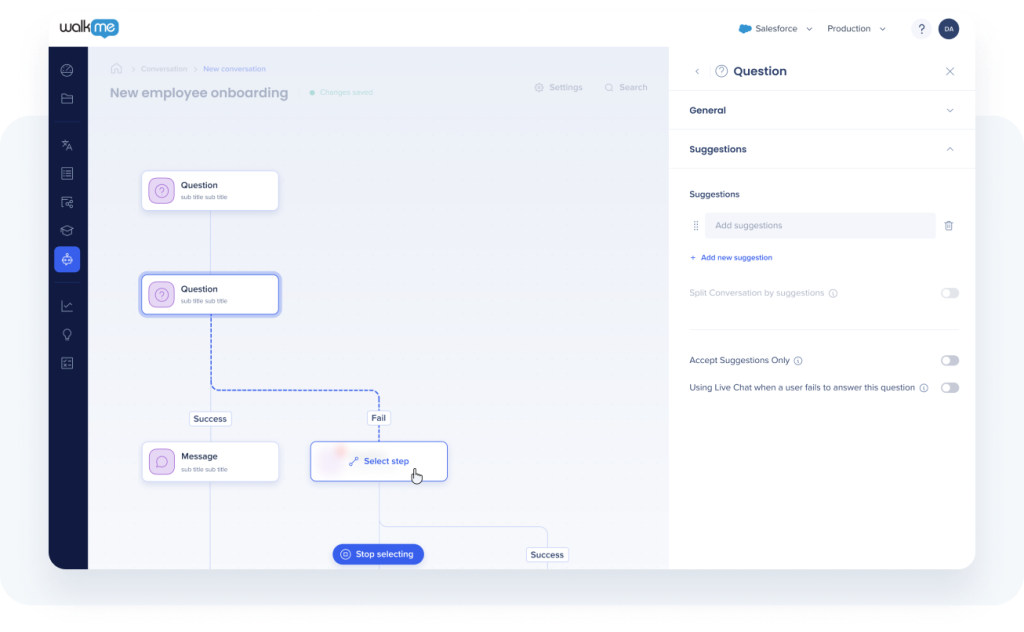 AI Answers verbindet sich mit den von Ihnen ausgewählten Wissensquellen und wird über das WalkMe-Menü aufgerufen, sodass Sie entscheiden können, wo es verfügbar ist und für welche Benutzer Neugierig auf KI-Antworten? Versuchen Sie es noch heute, indem Sie in unserem Help Center suchen.