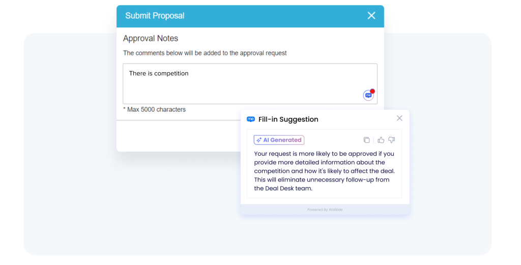 Fügen Sie einfach einen KI-SmartTip zu jedem offenen Textfeld hinzu (wie in Ihrem Leistungsmanagement, der Verkaufsmöglichkeit oder IT-Ticketing-Formularen) und die KI-Technologie von WalkMe erledigt den Rest. AI SmartTips bewerten Benutzereingaben und validieren entweder die Antwort oder bieten eine maßgeschneiderte Anleitung, um die Antwort zu verbessern. Verabschieden Sie sich von „n/a“ oder „weiß nicht“ und begrüßen Sie die legitimen Informationen.