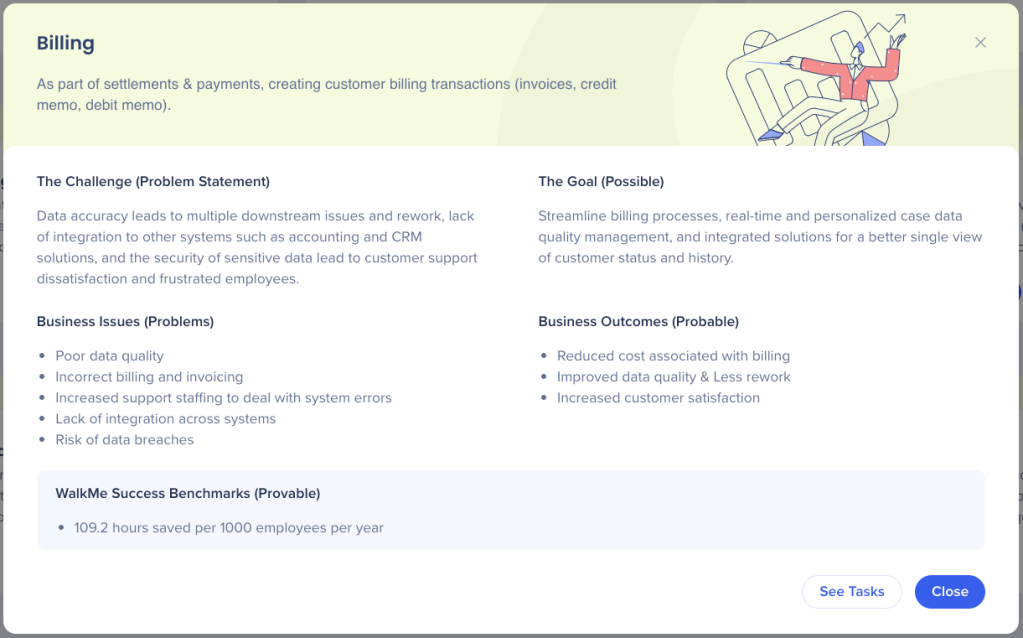 Bevor Sie in die Entwicklung von Inhalten eintauchen, müssen Sie zuerst das Geschäftsproblem verstehen und artikulieren, das Sie lösen möchten, sowie wie Ihre WalkMe-Lösung helfen wird. Verwenden Sie unsere Best-in-Class Strategie & Wertrahmen, um die 4 Ps zuzuordnen: Problem , mögliches , wahrscheinliches und nachweisbares .