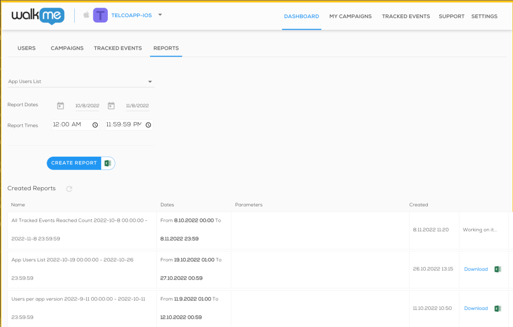 Benutzerdefinierte Berichte erlauben es Ihnen, das Verhalten Ihrer Benutzer von der App aus zu verfolgen. So haben Sie die Möglichkeit, alle Dokumente in ein Excel-Format zu exportieren mit allen Analyseeigenschaften in Bezug auf Ihre App und das Verhalten ihrer Benutzer, einschließlich nachverfolgter erreichter Ereignisse, auf den App-Bildschirmen verbrachter Zeit, allgemeine Kampagnenaktionen und mehr.