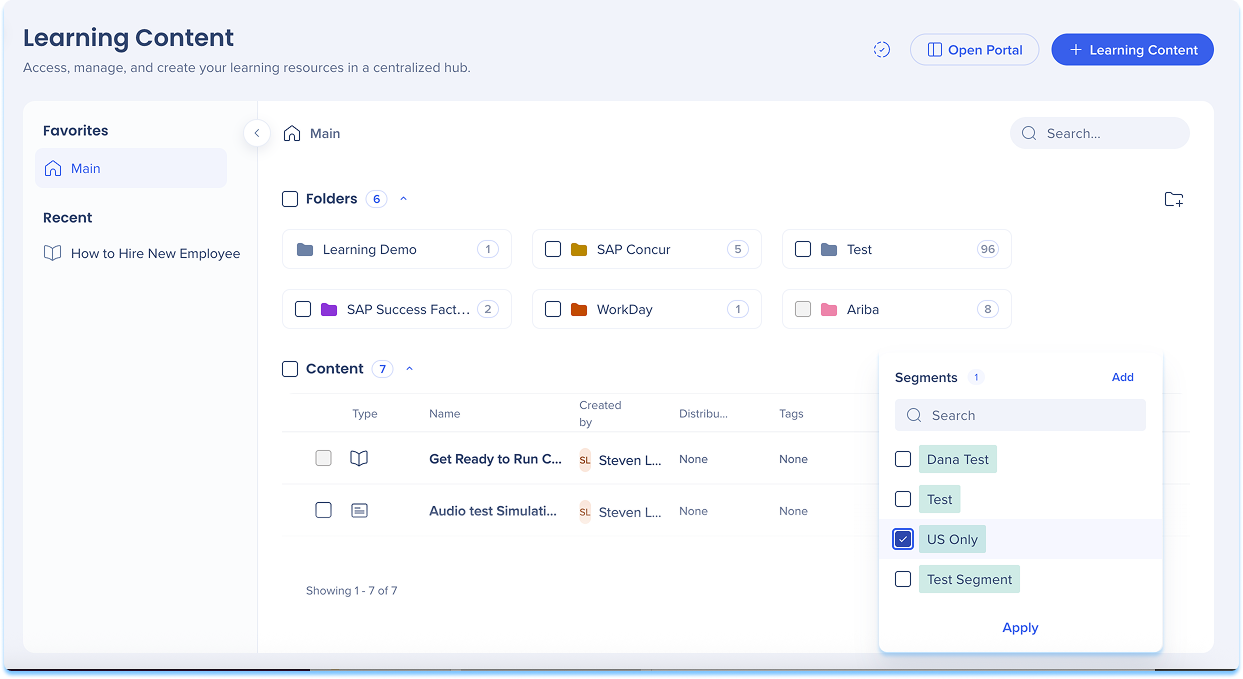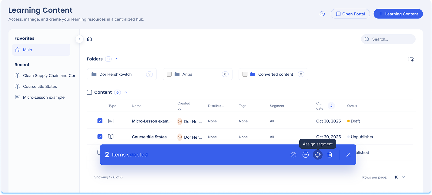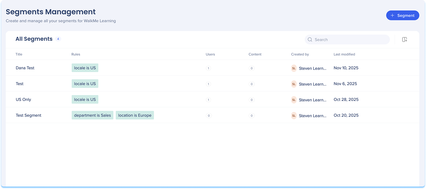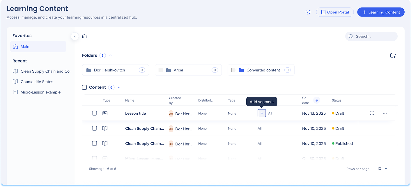 Segmente können auf der Seite Lerninhalte hinzugefügt und zugewiesen werden. Verwenden Sie diese Seite, um neue Segmente zu erstellen oder vorhandene Segmente auf Lernelemente anzuwenden.