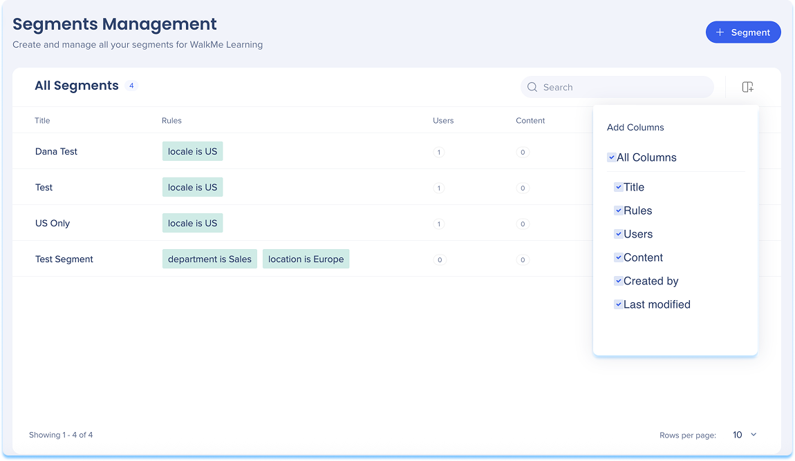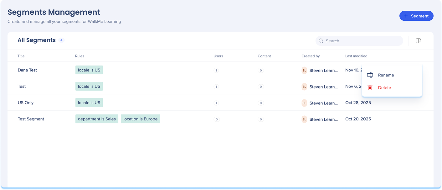 Auf der Seite „Segmentverwaltung“ können Sie Segmente hinzufügen, bearbeiten, umbenennen oder löschen, die in Lerninhalten verwendet werden.