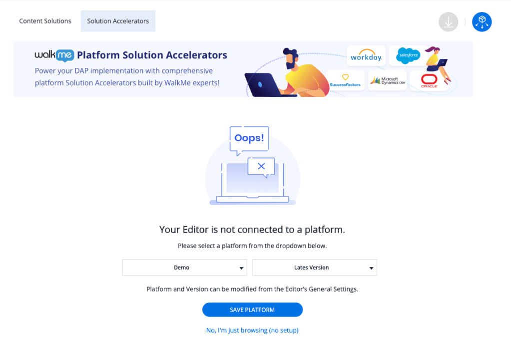 Damit Solution Accelerator wie erwartet abspielen, muss der Editor mit einer Element-Bibliothek verbunden sein und plattformspezifische Konfigurationen haben. Wenn WalkMe feststellt, dass ein Editor nicht mit einer Element-Bibliothek verbunden oder nicht richtig konfiguriert ist, werden Seiten angezeigt, die Sie durch den Aktivierungsprozess führen.