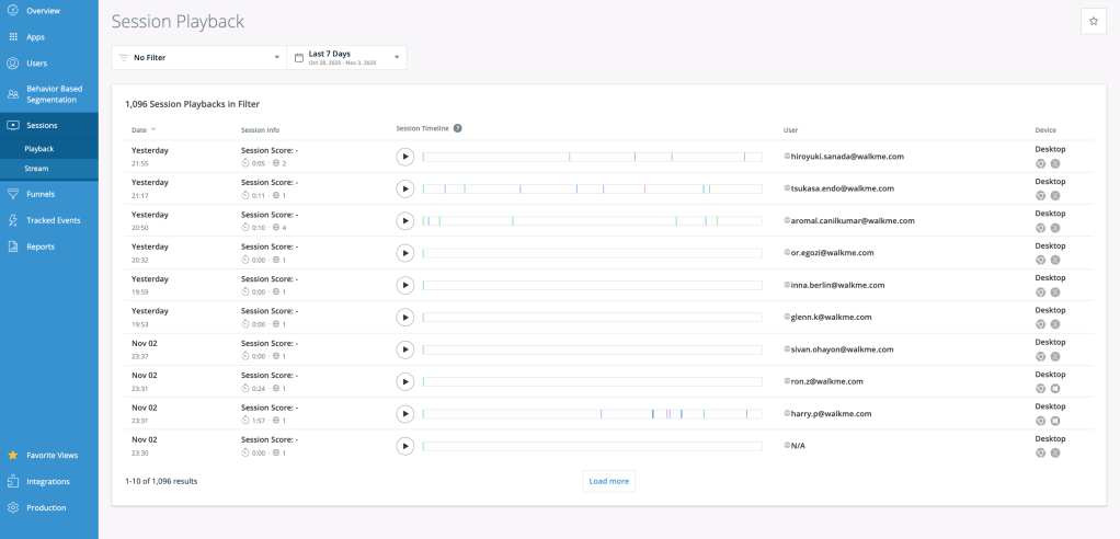Wenn die Session Playback-Erfassung auf Ihrer Website aktiviert ist, beginnt Insights mit der Erfassung zusätzlicher Benutzerdaten auf allen Seiten, auf denen WalkMe verfügbar ist, und organisiert die Daten in verschiedene Benutzersitzungen.