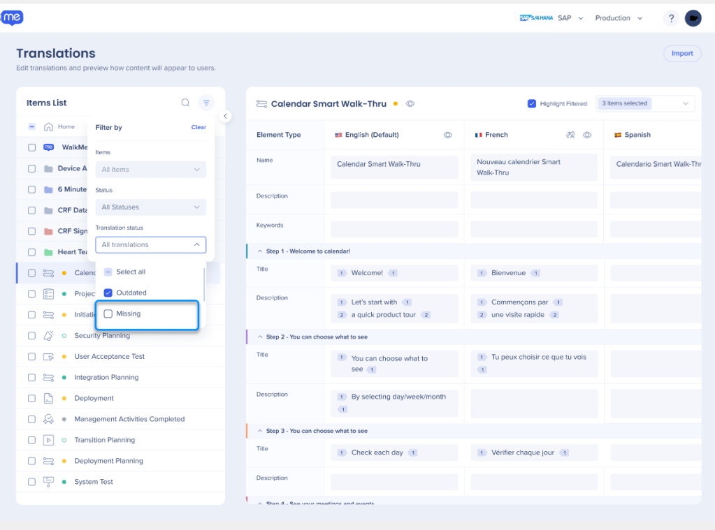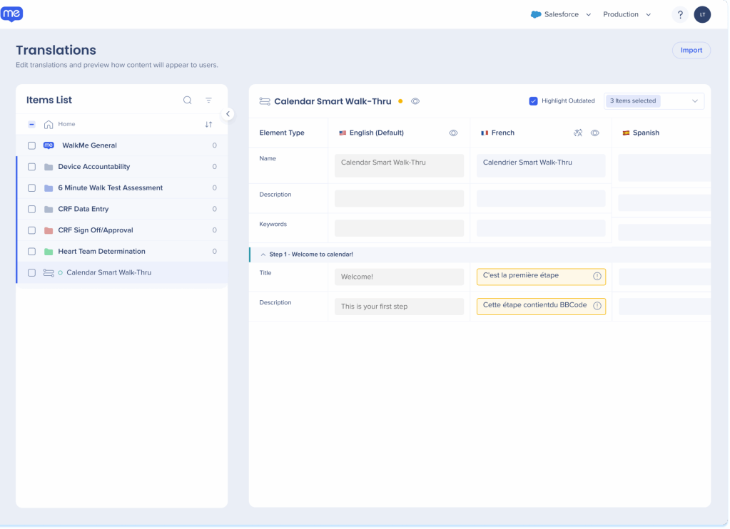 Auf der Seite Übersetzungen können Sie bearbeiten und verwalten, wie Ihre WalkMe-Inhalte in verschiedenen Sprachen angezeigt werden. Hier können Sie die Übersetzungen für alle Elemente in Ihrem Konto anzeigen, aktualisieren und in der Vorschau anzeigen, um eine konsistente mehrsprachige Erfahrung zu gewährleisten.