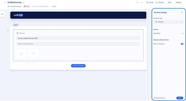 Este artículo explica cómo crear encuestas en la consola de WalkMe, incluyendo cómo iniciar una nueva encuesta, añadir preguntas y páginas, obtener una vista previa de las encuestas y prepararlas para su publicación o distribución.