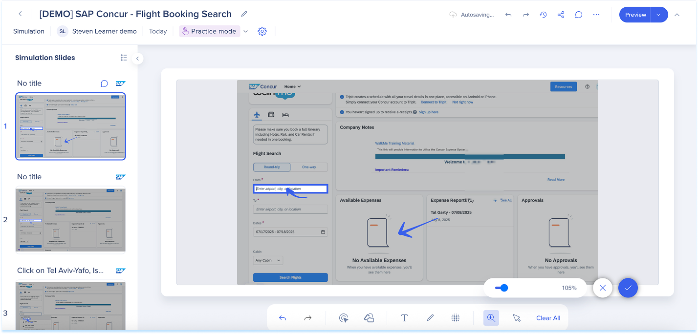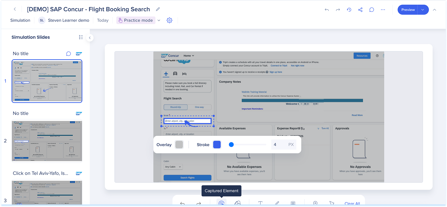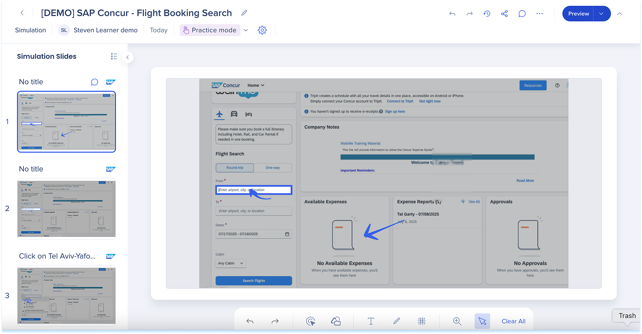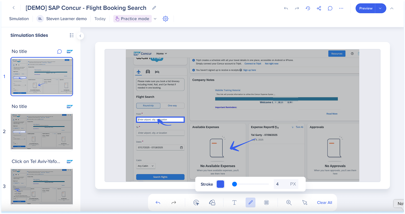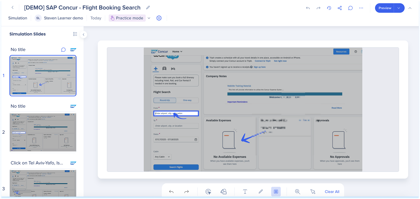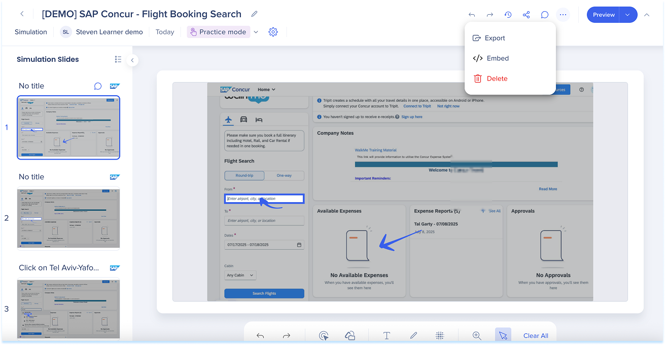 Las simulaciones en WalkMe Learning Arc te permiten capturar flujos de trabajo reales y reproducirlos en modos de demostración, práctica o prueba. Esto ayuda a los estudiantes a comprender los procesos en un entorno guiado y controlado. Editar una simulación te permite modificar diapositivas, añadir anotaciones visuales y cambiar entre modos. También puedes ajustar la configuración específica del modo y visualizar la experiencia desde el punto de vista de un alumno. Juntas, estas herramientas facilitan la creación de simulaciones detalladas e interactivas que mejoran la experiencia de aprendizaje.