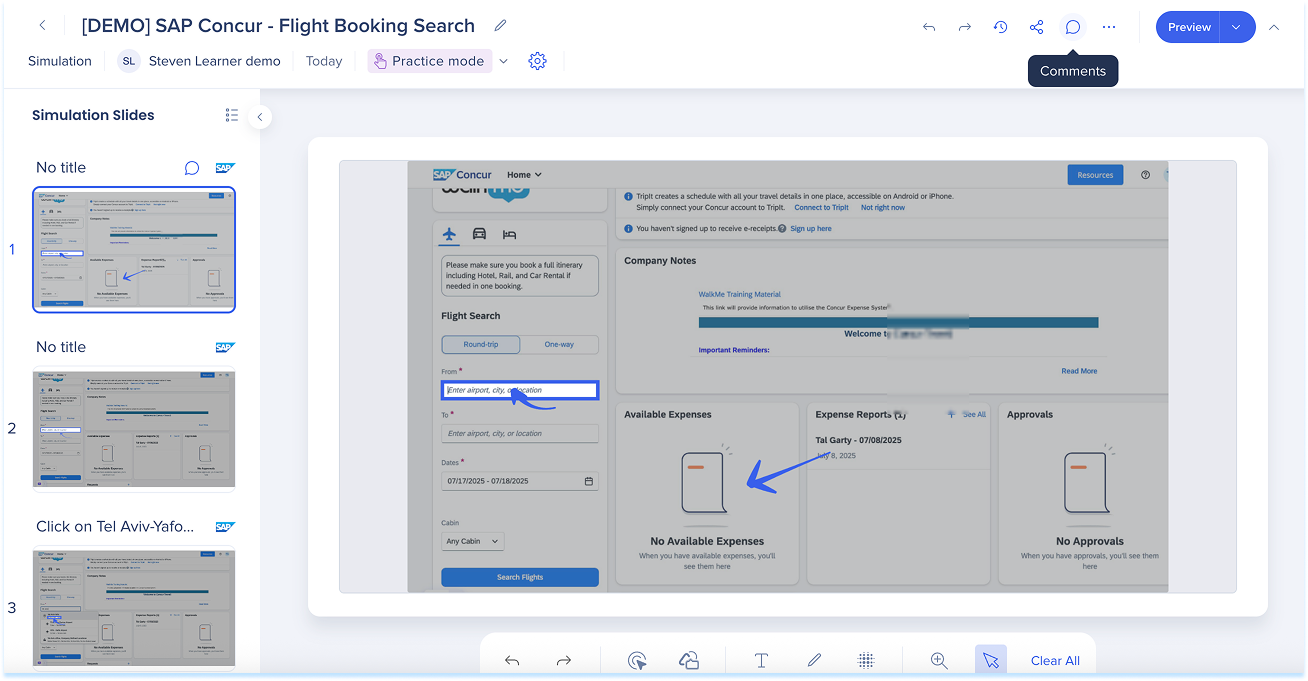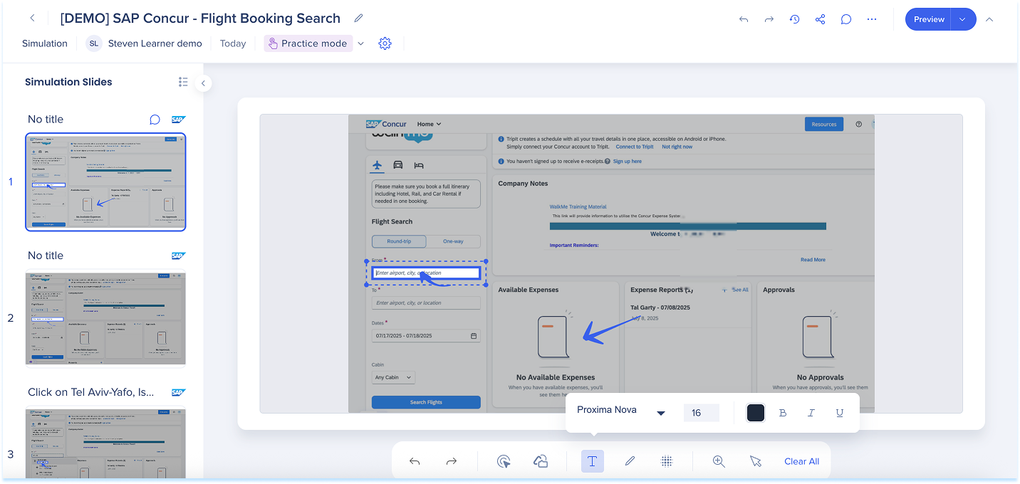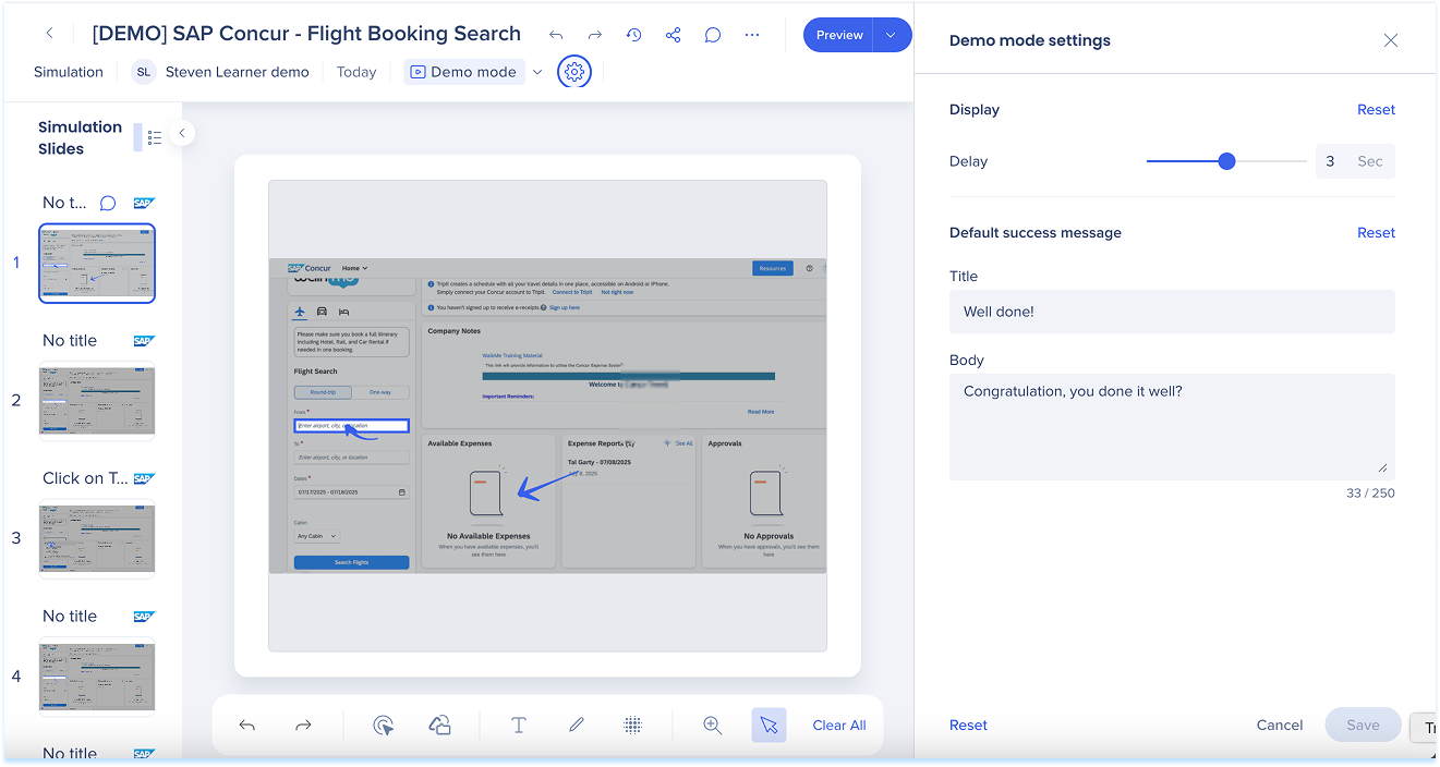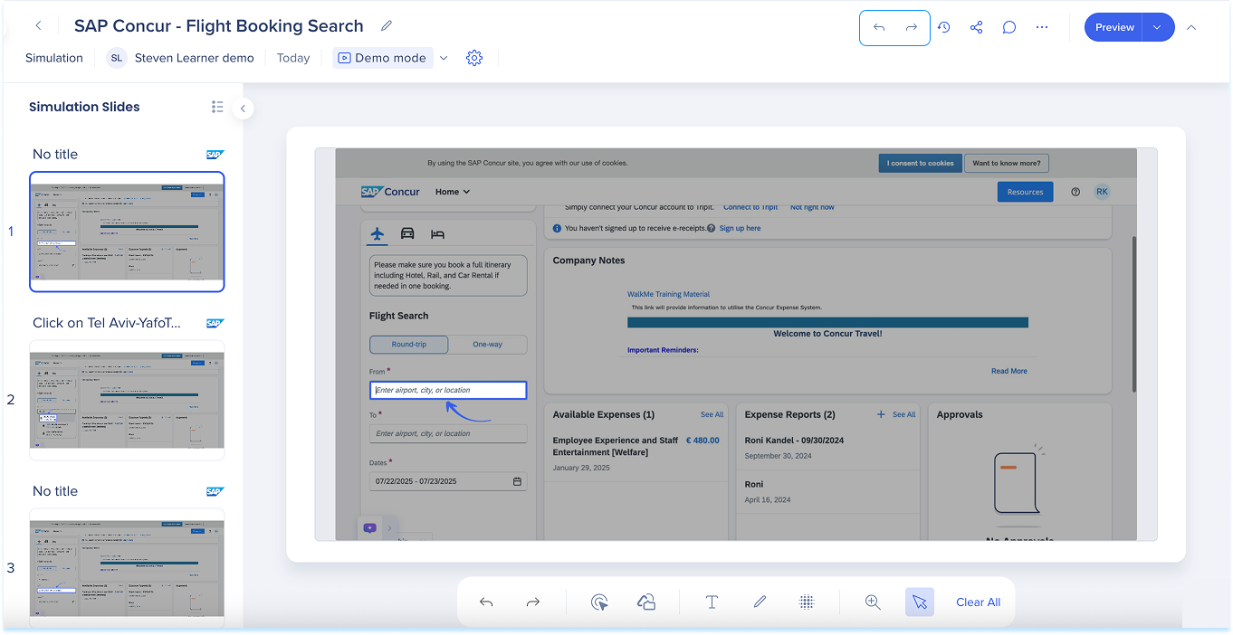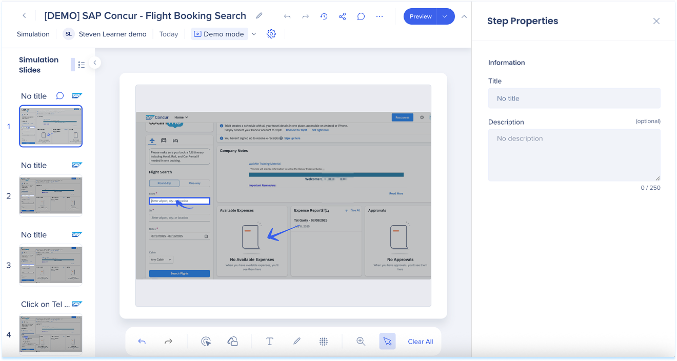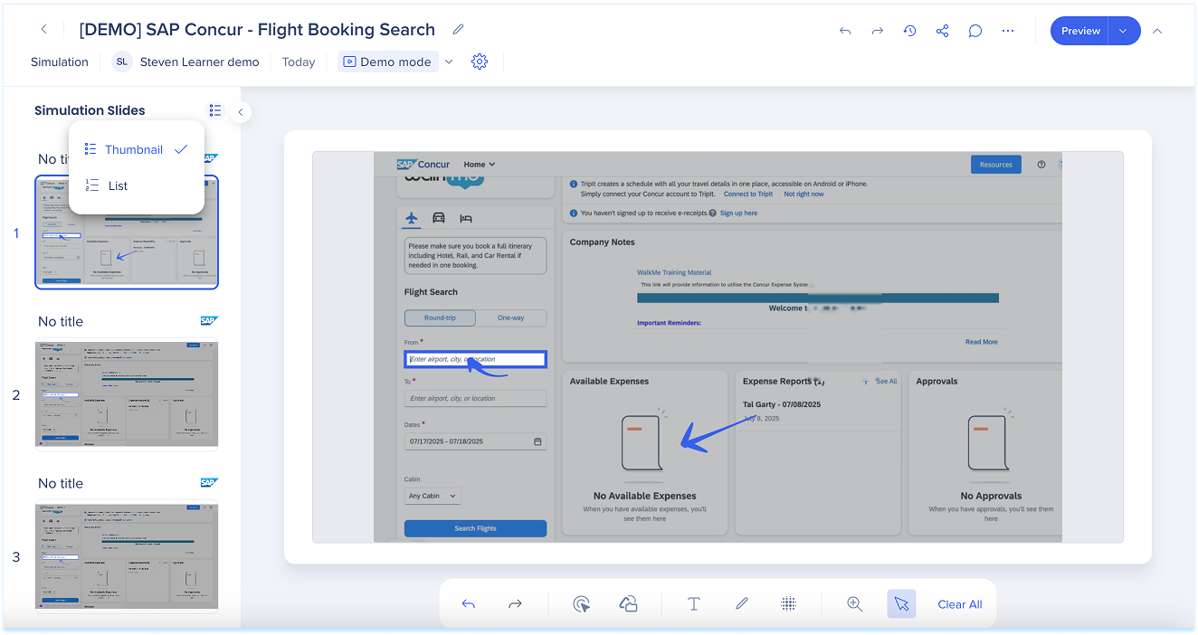 Las simulaciones en WalkMe Learning Arc te permiten capturar flujos de trabajo reales y reproducirlos en modos de demostración, práctica o prueba. Esto ayuda a los estudiantes a comprender los procesos en un entorno guiado y controlado. Editar una simulación te permite modificar diapositivas, añadir anotaciones visuales y cambiar entre modos. También puedes ajustar la configuración específica del modo y visualizar la experiencia desde el punto de vista de un alumno. Juntas, estas herramientas facilitan la creación de simulaciones detalladas e interactivas que mejoran la experiencia de aprendizaje.