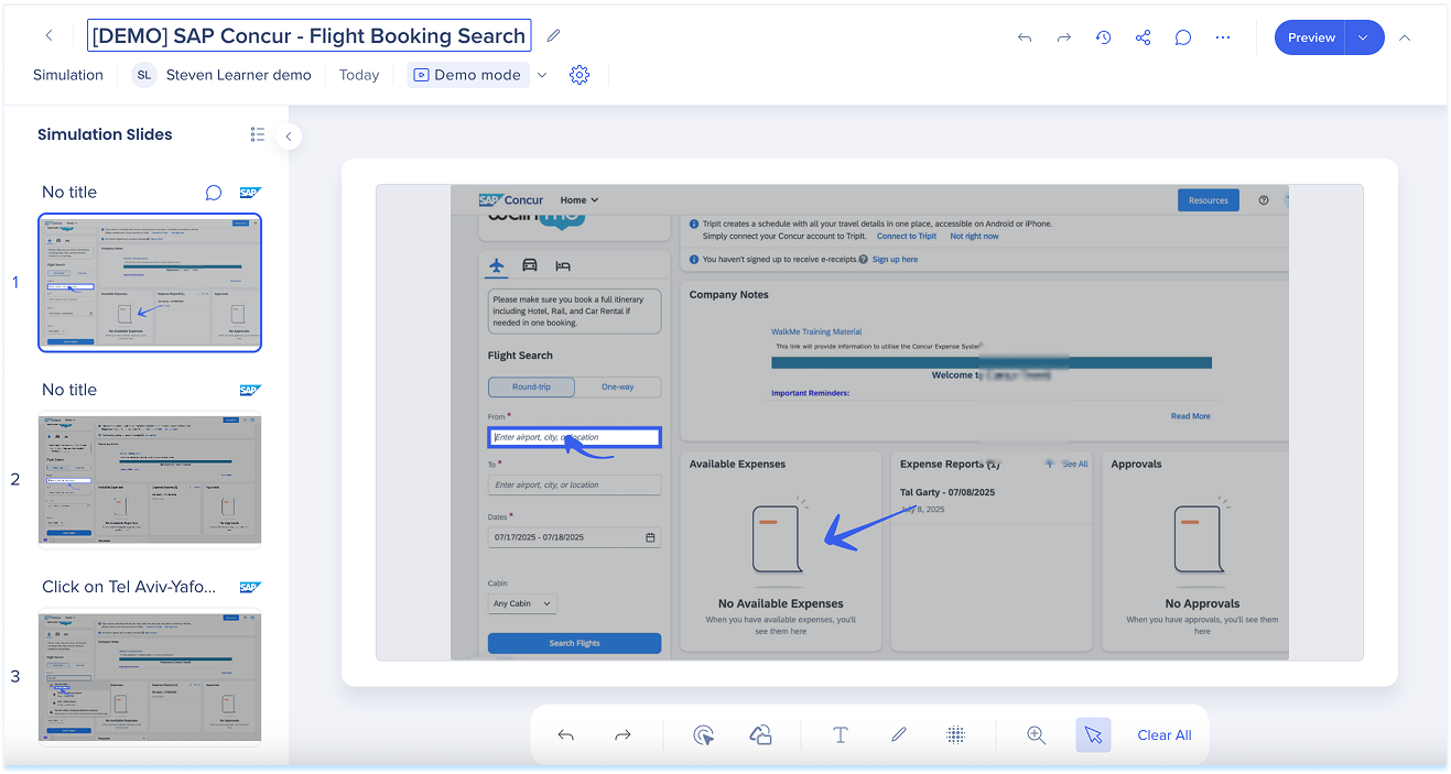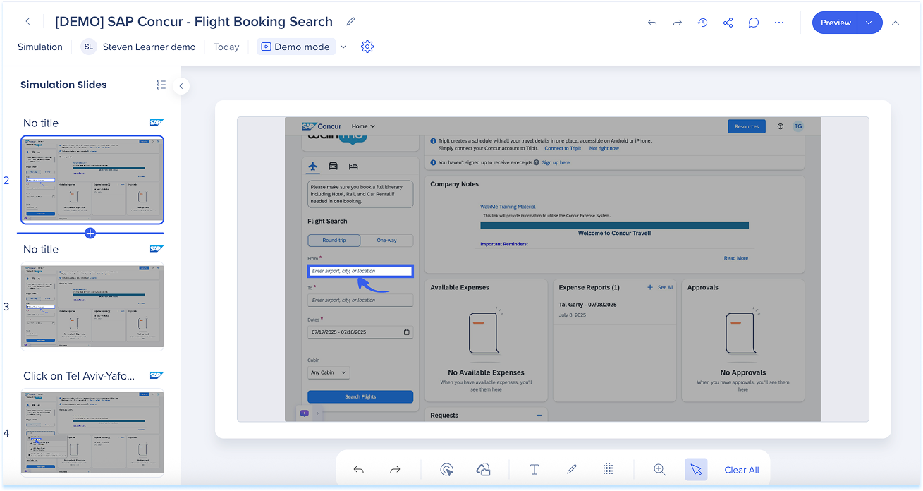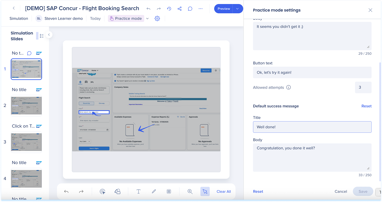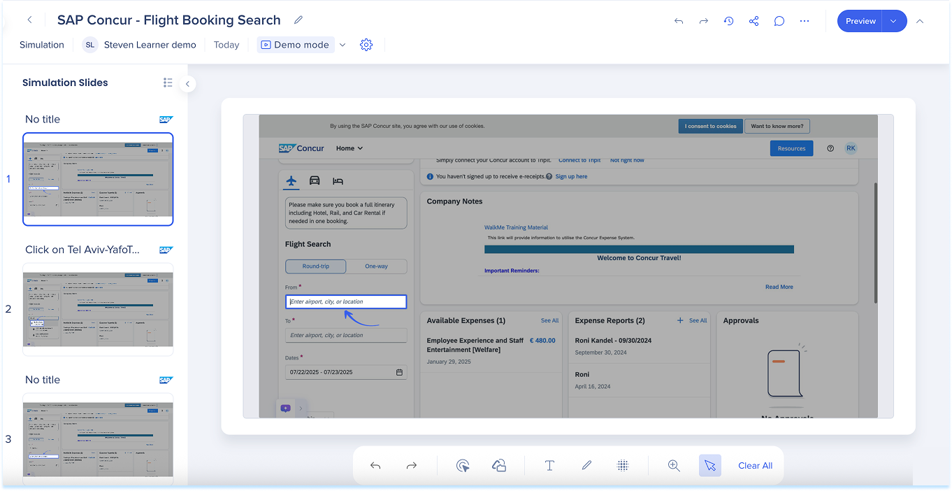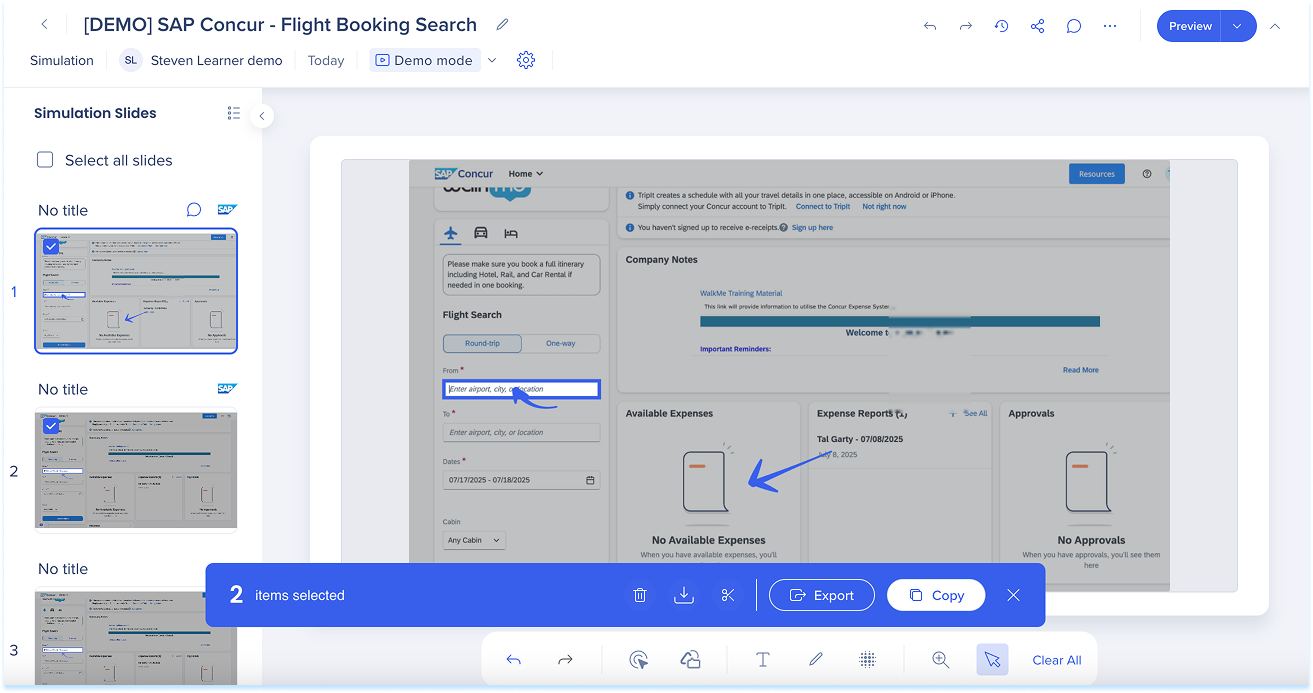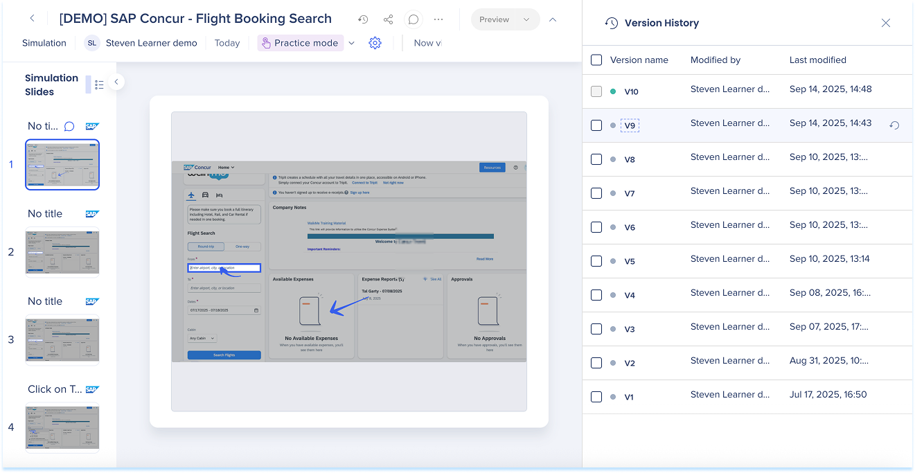 Las simulaciones en WalkMe Learning Arc te permiten capturar flujos de trabajo reales y reproducirlos en modos de demostración, práctica o prueba. Esto ayuda a los estudiantes a comprender los procesos en un entorno guiado y controlado. Editar una simulación te permite modificar diapositivas, añadir anotaciones visuales y cambiar entre modos. También puedes ajustar la configuración específica del modo y visualizar la experiencia desde el punto de vista de un alumno. Juntas, estas herramientas facilitan la creación de simulaciones detalladas e interactivas que mejoran la experiencia de aprendizaje.
