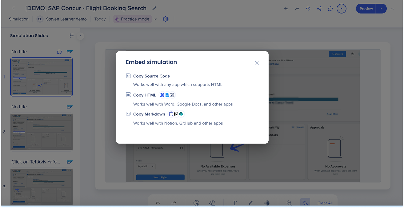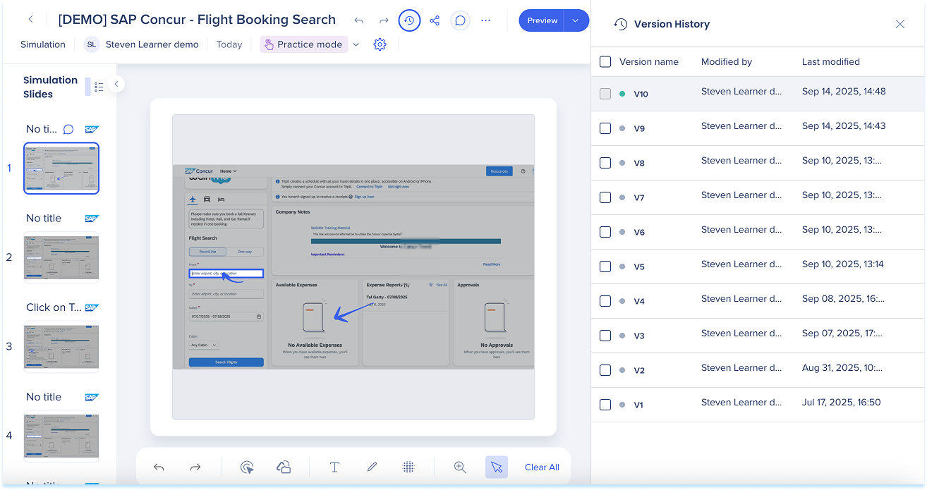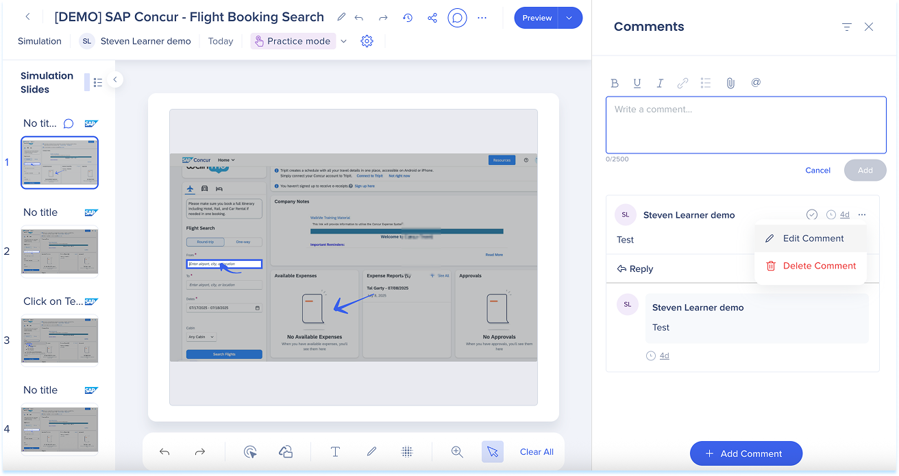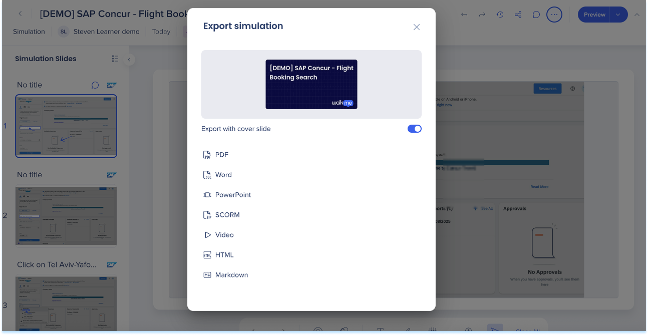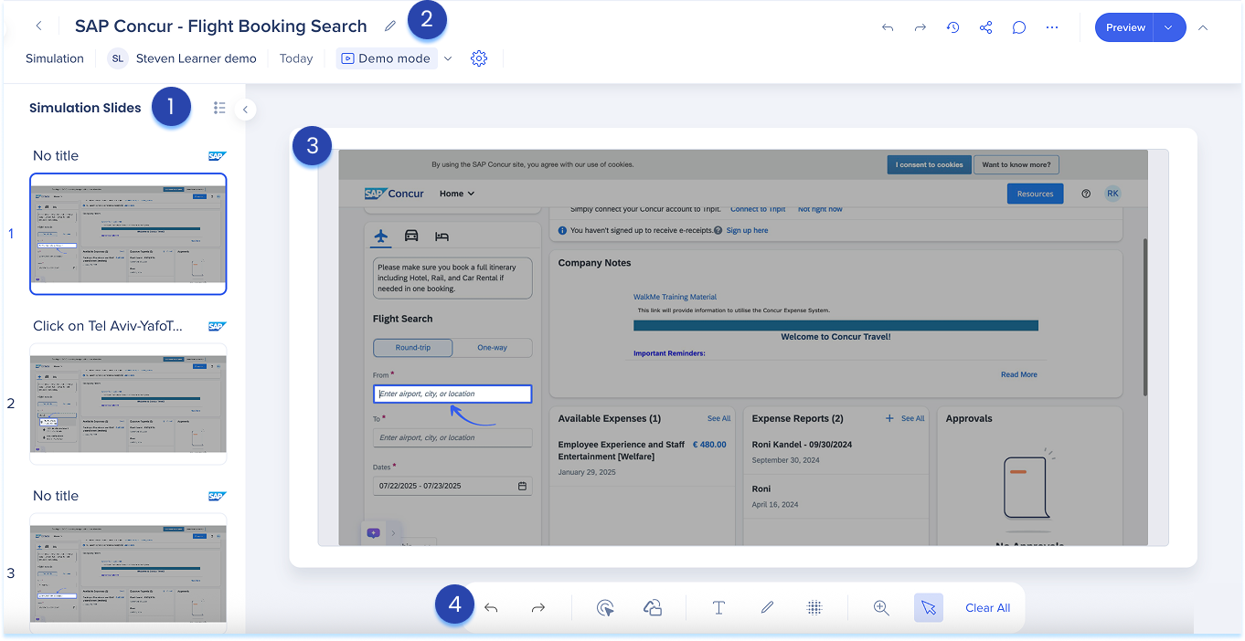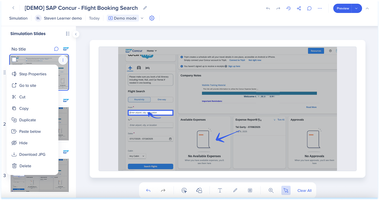 Las simulaciones en WalkMe Learning Arc te permiten capturar flujos de trabajo reales y reproducirlos en modos de demostración, práctica o prueba. Esto ayuda a los estudiantes a comprender los procesos en un entorno guiado y controlado. Editar una simulación te permite modificar diapositivas, añadir anotaciones visuales y cambiar entre modos. También puedes ajustar la configuración específica del modo y visualizar la experiencia desde el punto de vista de un alumno. Juntas, estas herramientas facilitan la creación de simulaciones detalladas e interactivas que mejoran la experiencia de aprendizaje.