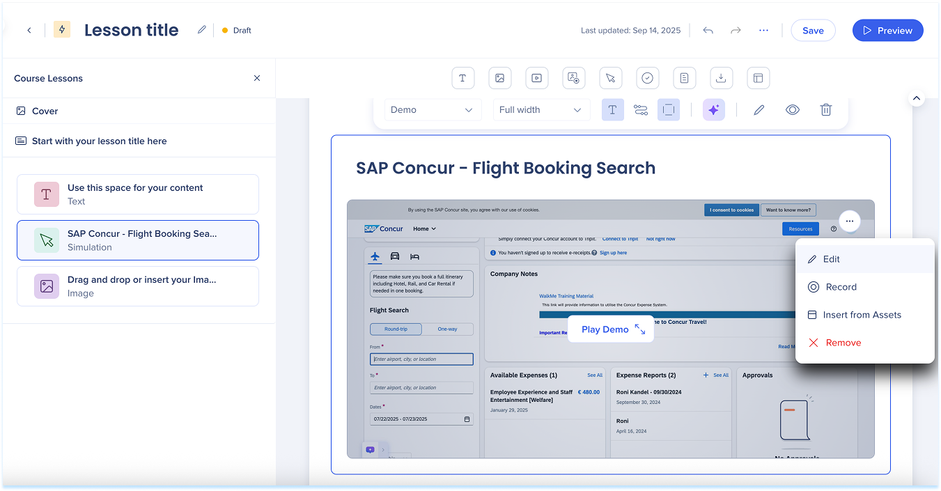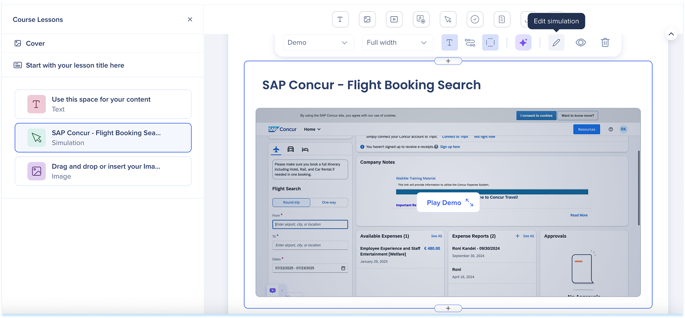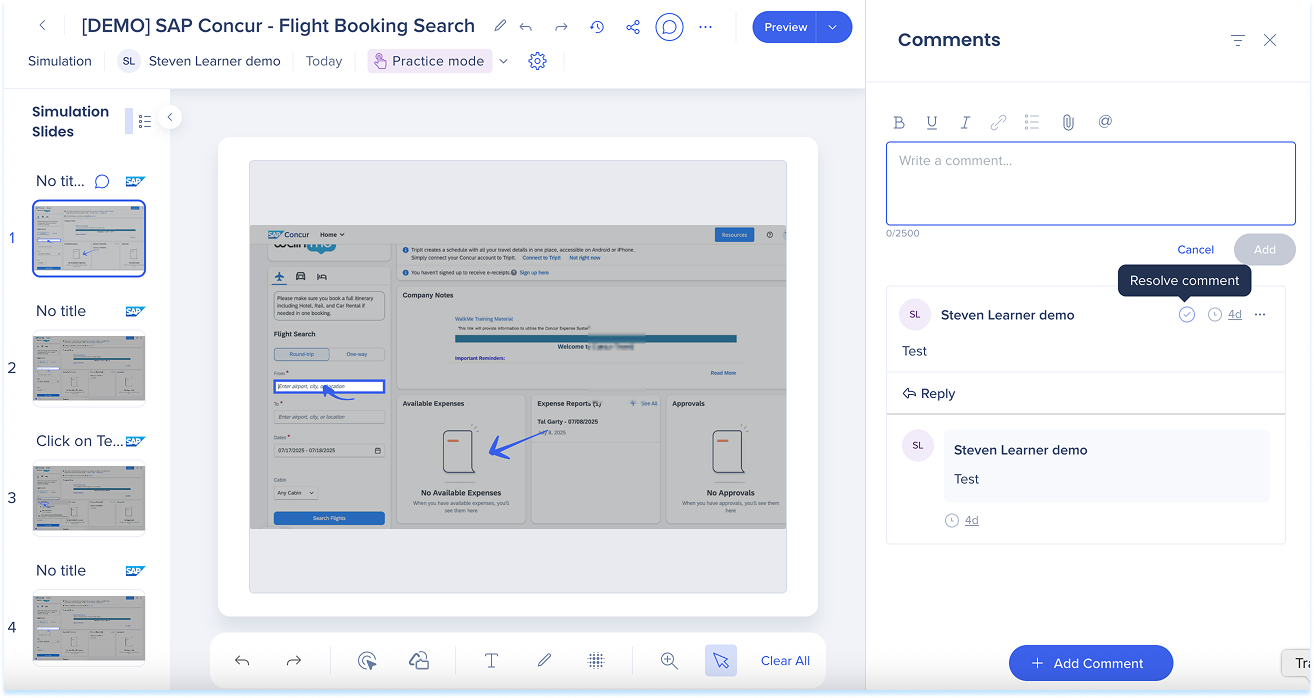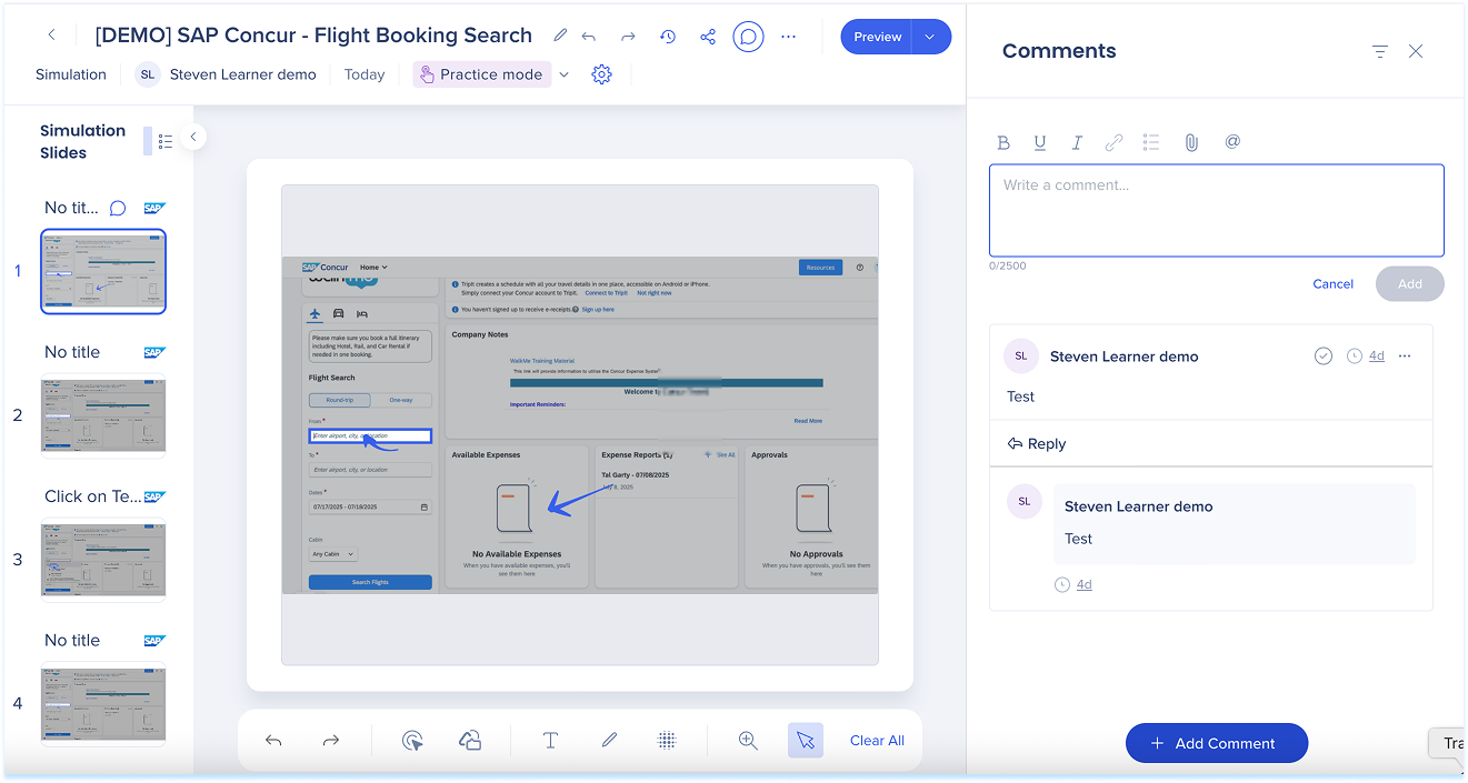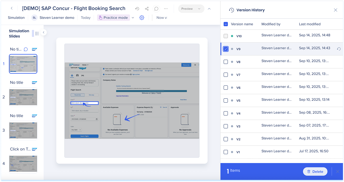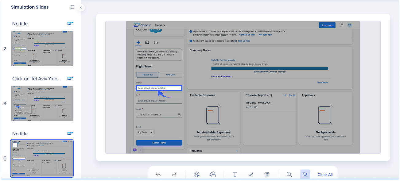 Las simulaciones en WalkMe Learning Arc te permiten capturar flujos de trabajo reales y reproducirlos en modos de demostración, práctica o prueba. Esto ayuda a los estudiantes a comprender los procesos en un entorno guiado y controlado. Editar una simulación te permite modificar diapositivas, añadir anotaciones visuales y cambiar entre modos. También puedes ajustar la configuración específica del modo y visualizar la experiencia desde el punto de vista de un alumno. Juntas, estas herramientas facilitan la creación de simulaciones detalladas e interactivas que mejoran la experiencia de aprendizaje.