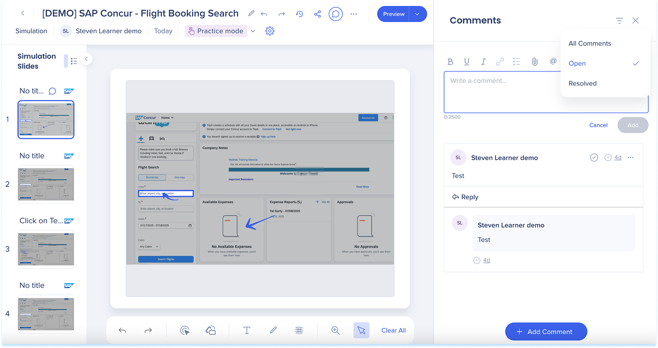 Las simulaciones en WalkMe Learning Arc te permiten capturar flujos de trabajo reales y reproducirlos en modos de demostración, práctica o prueba. Esto ayuda a los estudiantes a comprender los procesos en un entorno guiado y controlado. Editar una simulación te permite modificar diapositivas, añadir anotaciones visuales y cambiar entre modos. También puedes ajustar la configuración específica del modo y visualizar la experiencia desde el punto de vista de un alumno. Juntas, estas herramientas facilitan la creación de simulaciones detalladas e interactivas que mejoran la experiencia de aprendizaje.