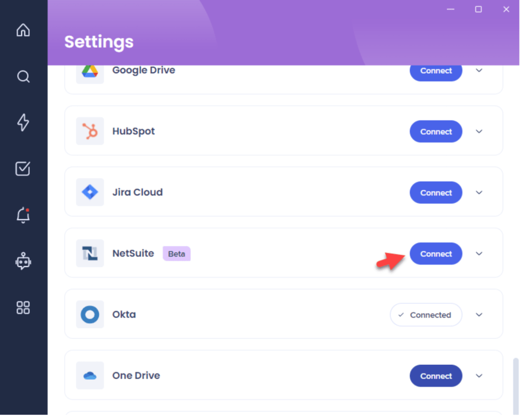 Si la tarjeta de NetSuite no está disponible, ponte en contacto con el administrador de WalkMe de tu organización y pídele que active NetSuite en el menú de escritorio.