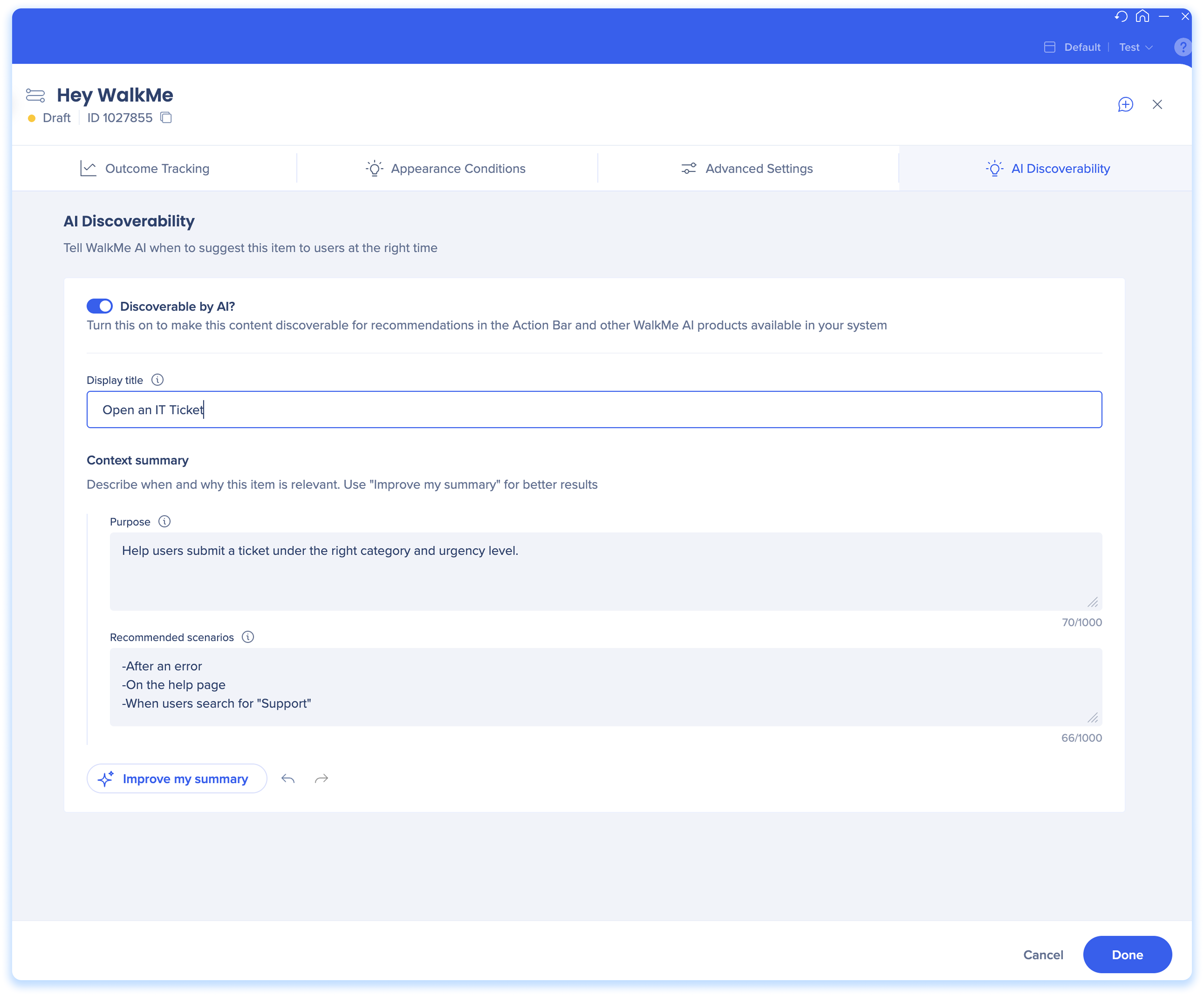 Para utilizar contenido de WalkMe en un lanzador seleccionado por IA, el contenido debe estar habilitado para la detectabilidad de IA.