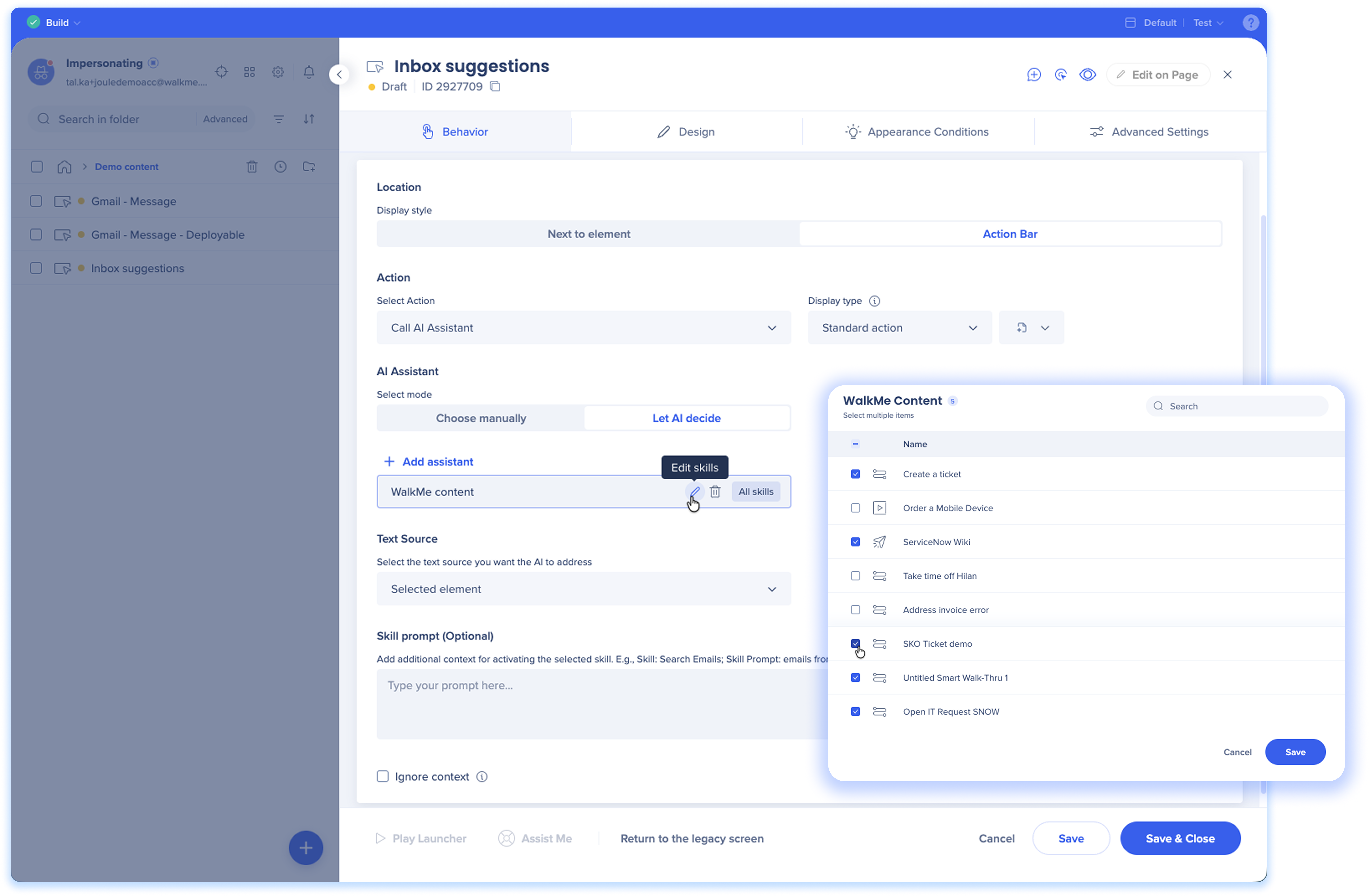 Para los creadores, habilitar lanzadores seleccionados por IA requiere muy poca configuración. Para las habilidades de Joule, los creadores pueden descargar lanzadores seleccionados por IA de la Galería de soluciones y publicarlos directamente en la barra de acciones de WalkMe Editor. Los creadores también pueden crear lanzadores seleccionados por AI desde cero, lo que les permite mostrar contenido de WalkMe y otras acciones de manera dinámica en función del contexto de usuario.