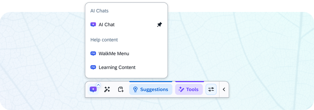 Con este lanzamiento, la barra de acción se vuelve más personalizable, lo que permite que todos puedan configurarla para que funcione mejor. Los usuarios pueden cambiar entre pestañas, fijar sus herramientas favoritas, como AI Chat o WalkMe Learning Arc, u ocultarlas por completo para un espacio de trabajo más limpio.