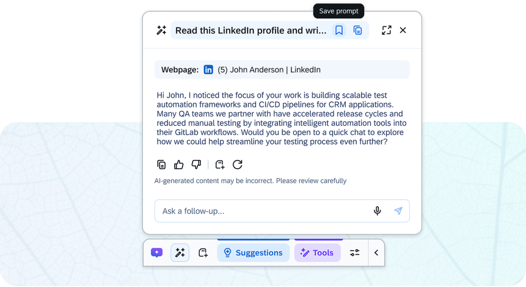 Las indicaciones de acción rápida como «Leer este perfil de LinkedIn y escribir un mensaje corto» ahora se pueden guardar como acciones personalizadas reutilizables para que los usuarios puedan completar tareas repetidas más rápidamente y mantener la concentración. Simple de crear y fácil de usar, es la eficiencia la que mantiene el impulso.