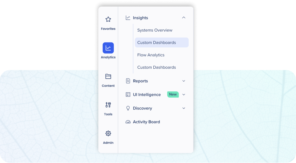 Navegar por el conjunto completo de aplicaciones de WalkMe en la consola se ha vuelto mucho más intuitivo. La Consola ahora presenta una navegación más limpia e intuitiva en el lado izquierdo. Las aplicaciones se agrupan en categorías claras: Contenido, Herramientas, Admin y Análisis, por lo que es más rápido encontrar lo que necesitas y mantener el espacio de trabajo organizado. Puedes marcar las aplicaciones más utilizadas para acceder rápidamente y contraer la nueva navegación izquierda para ahorrar espacio. Pasa el cursor para expandirlo instantáneamente, lo que mantendrá el flujo de trabajo fluido y eficiente.