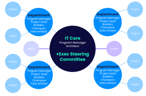 Muchas organizaciones de silos optan por centralizarse con un núcleo de TI y un comité de dirección ejecutivo, en un modelo híbrido o descentralizado. A medida que la TI desarrolla su nivel de propiedad, supervisa un movimiento paralelo para conectar las líneas de negocio y desarrollar una iniciativa de intercambio de conocimientos conocida como comunidad de práctica.