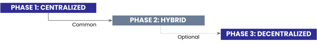 Descripción y aspecto visual de cada modelo de gobernanza mostrado anteriormente. Mapas detallados de propiedad para una estrategia de escalado común de Centralizado a Híbrido.