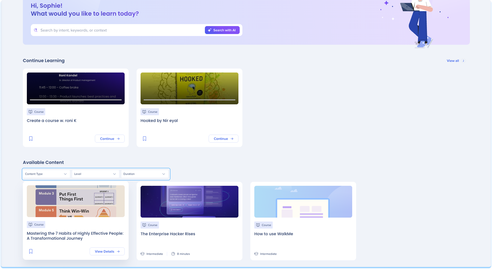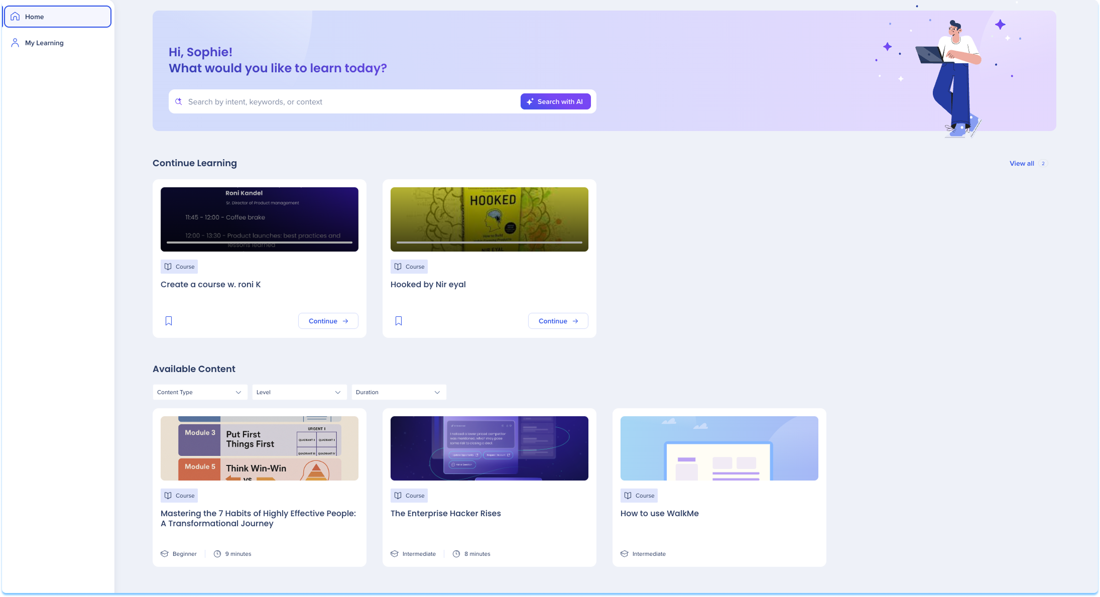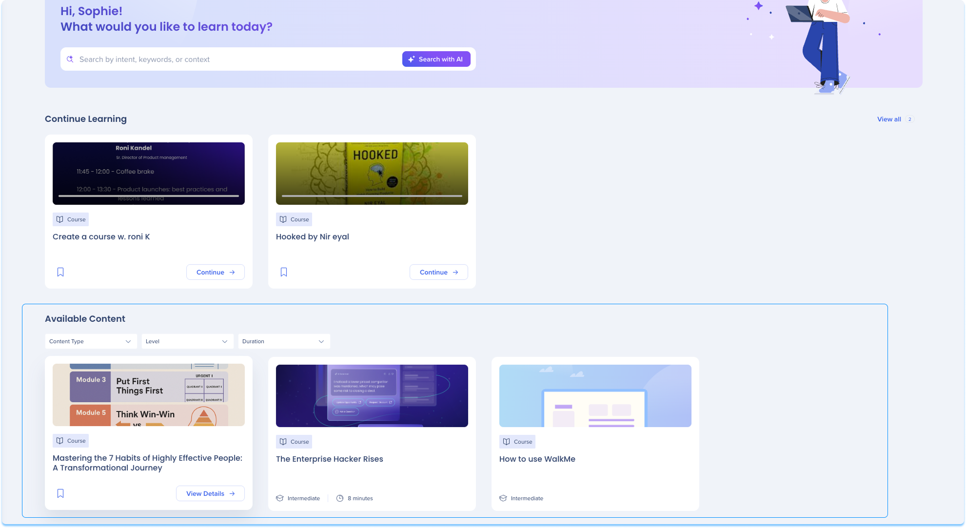 Esta sección muestra todo el contenido de aprendizaje al que puedes acceder, en función de tu rol, los permisos y las reglas de segmentación.