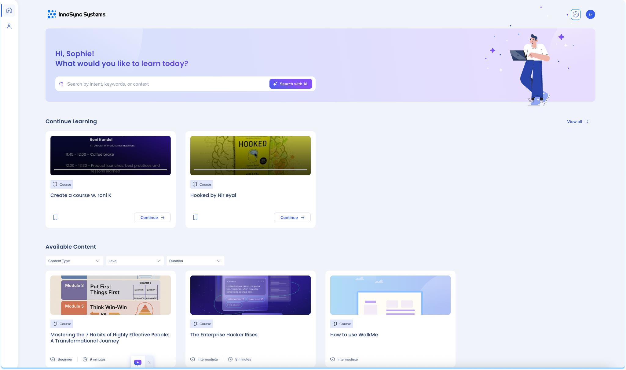 Ya sea que se trate de un microaprendizaje, un curso completo o un recorrido estructurado, el portal muestra todo el contenido de aprendizaje publicado que los usuarios pueden ver, filtrado a través de reglas y permisos de segmento. Las herramientas de búsqueda y filtro integradas ayudan a las personas en formación a encontrar rápidamente contenido relevante para sus objetivos.