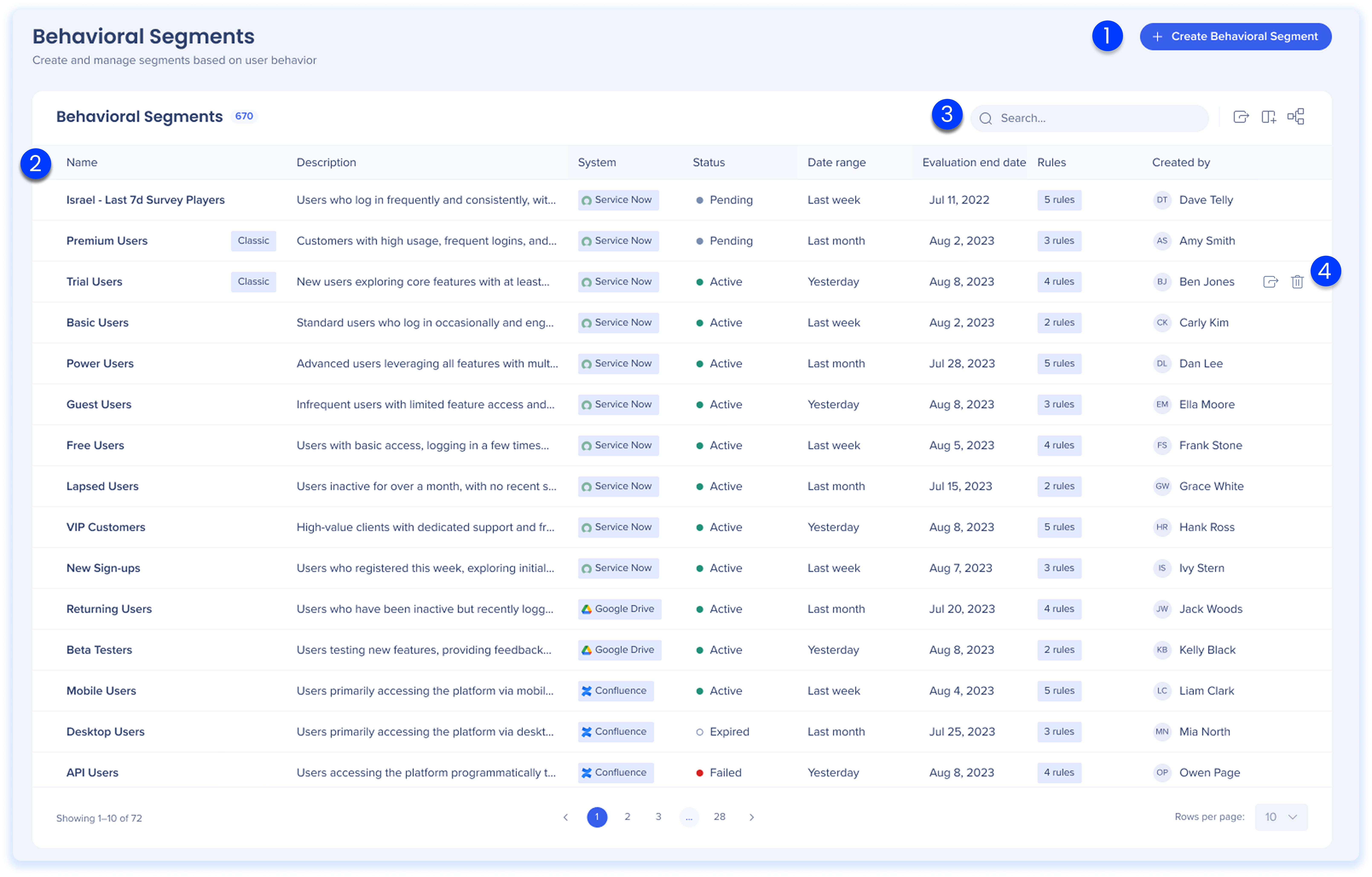 La página Segmentos de comportamiento en la consola es tu centro para definir y administrar grupos de usuarios en función de su actividad. Desde aquí, puedes supervisar el estado de tus segmentos, realizar mantenimiento y exportar listas de usuarios para generar informes.