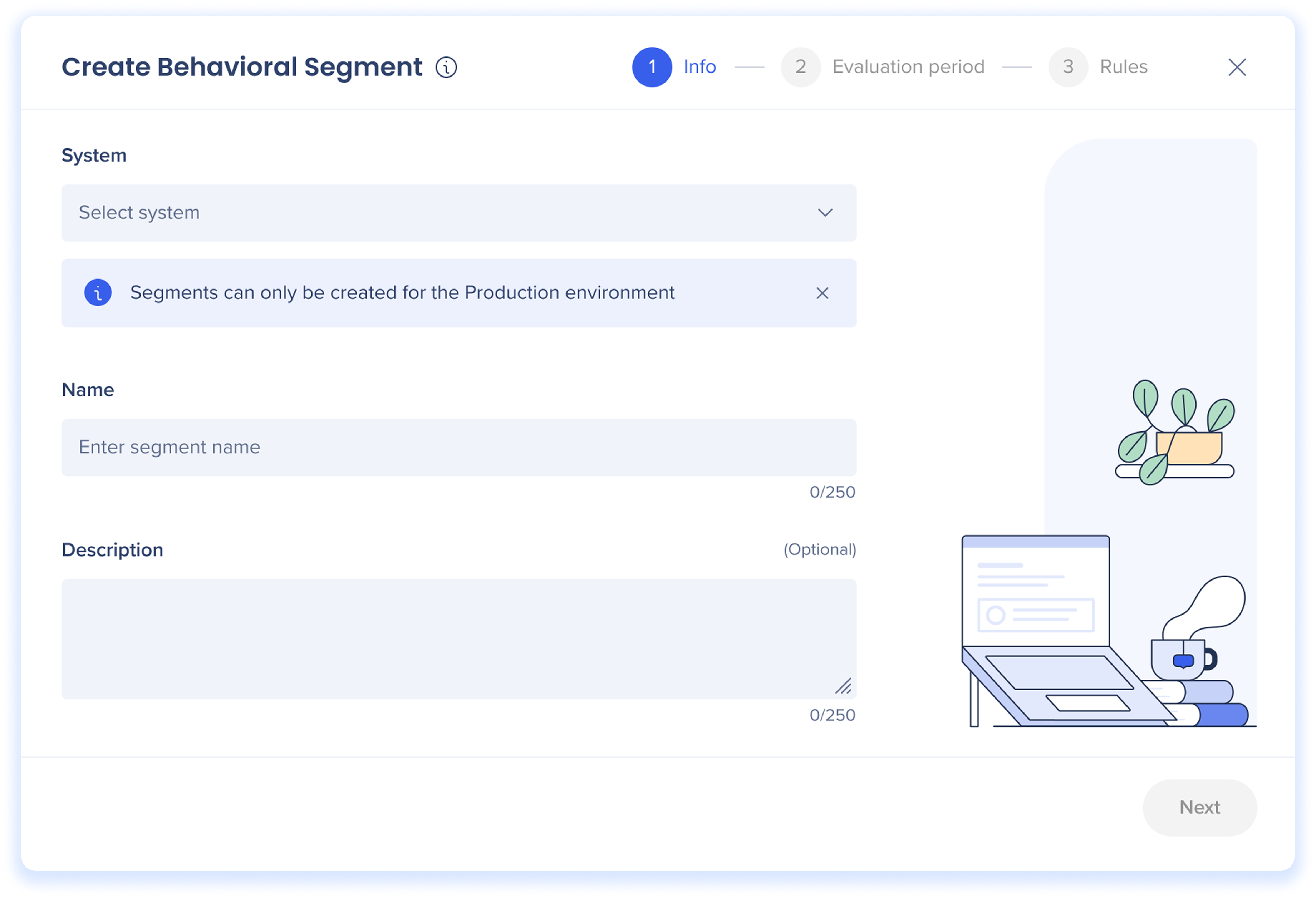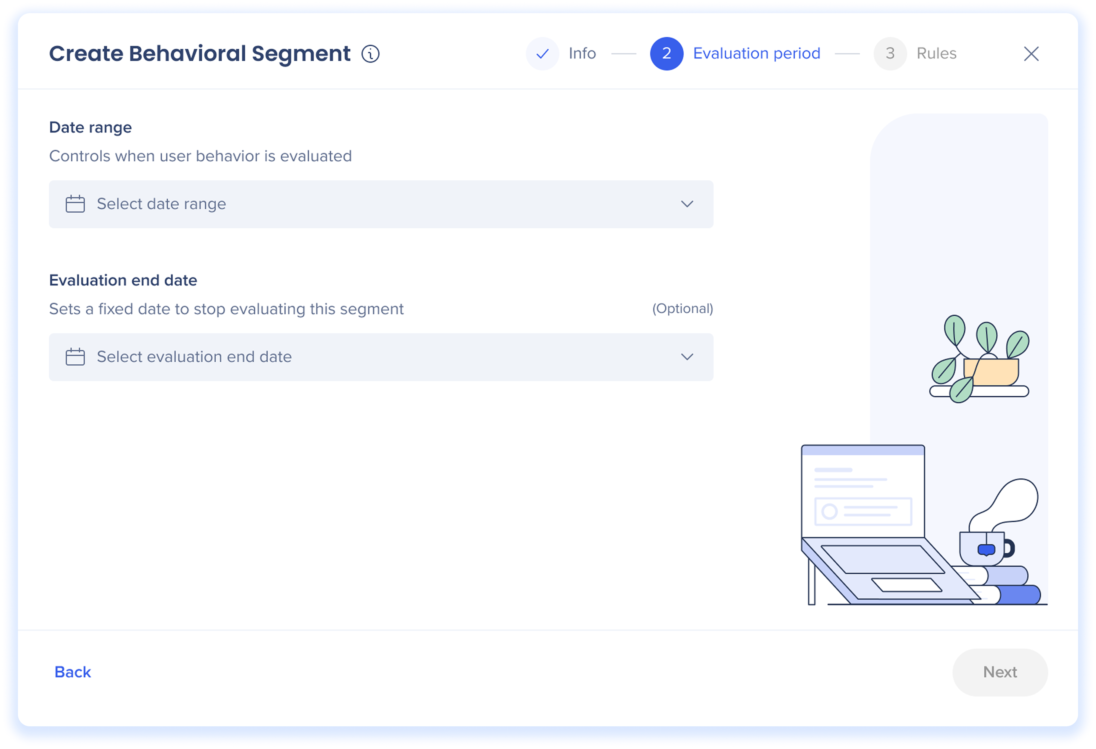 Selecciona + Crear segmento de comportamiento para abrir el generador de segmentos de tres pasos.