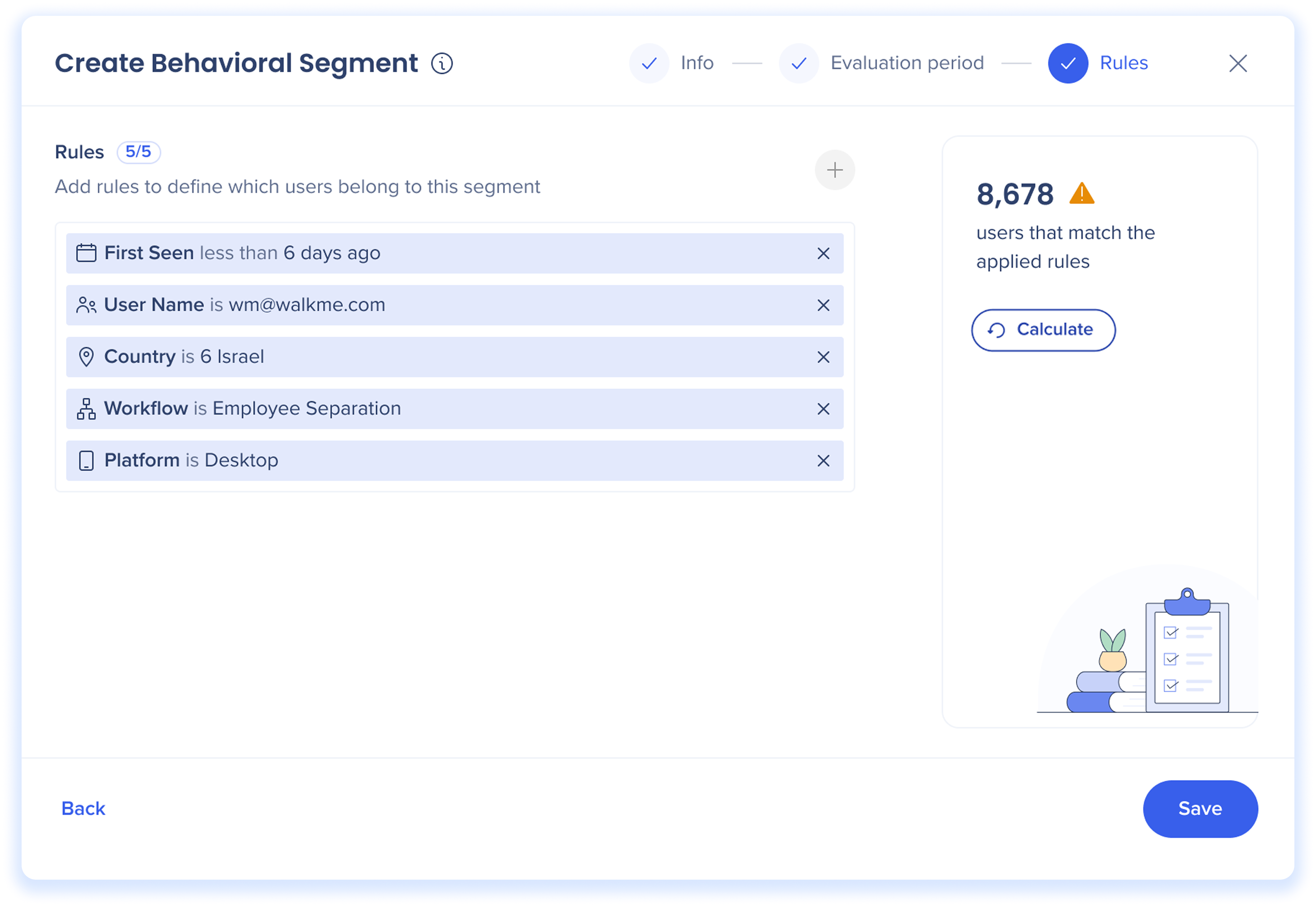 Esta función te permite definir un segmento basado en características de usuario, acciones o atributos recopilados por WalkMe. Luego puedes aplicar ese segmento al crear tu contenido.