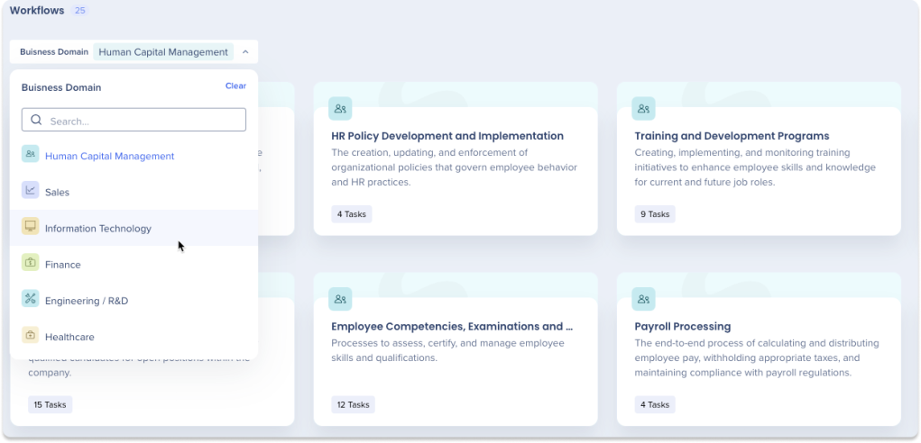 Utiliza el filtro Dominio empresarial para ver solo los flujos de trabajo relevantes para tu área de negocio específica.