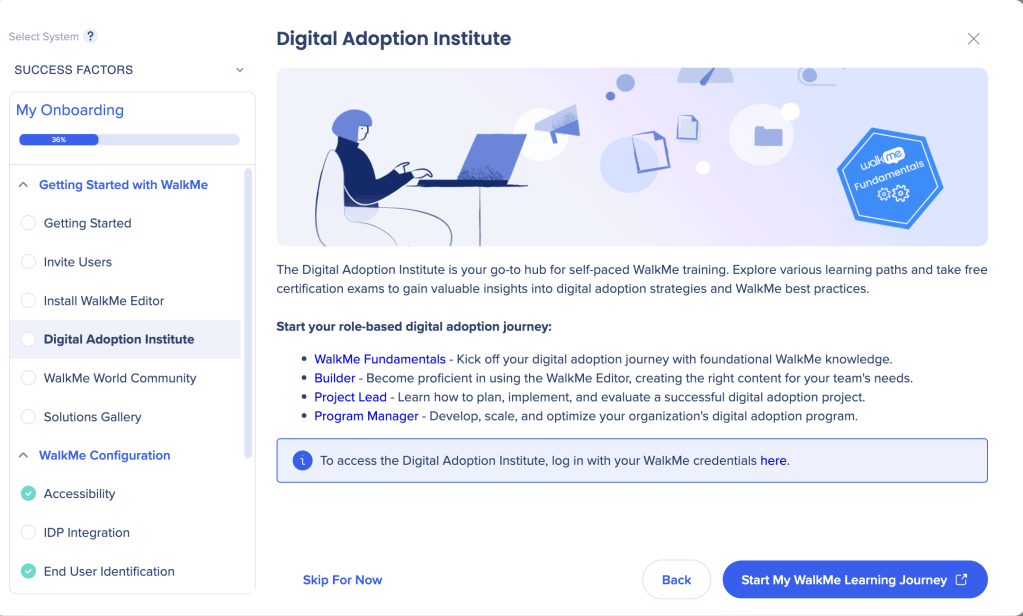 Puedes acceder al Digital Adoption Institute para obtener formación y certificaciones de WalkMe a tu propio ritmo.