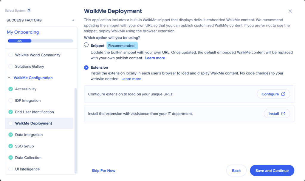 Si seleccionas este método, primero tendrás que configurar la extensión para definir las URL únicas en las que deseas que se cargue WalkMe.