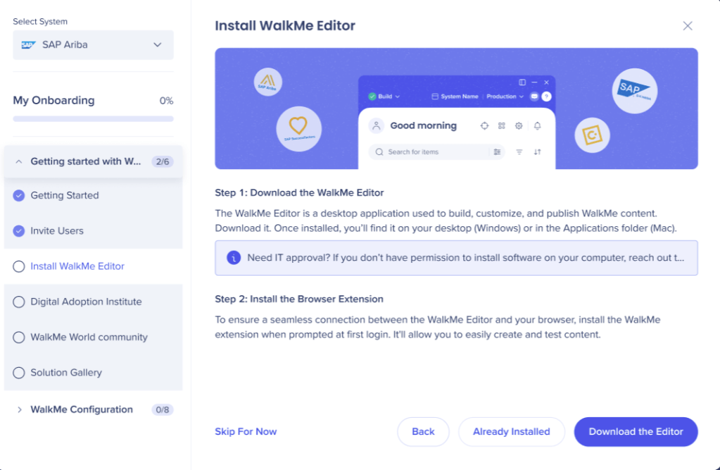 Instala la extensión del navegador WalkMe cuando se te solicite para asegurarte de que el editor se conecte correctamente con tu navegador.