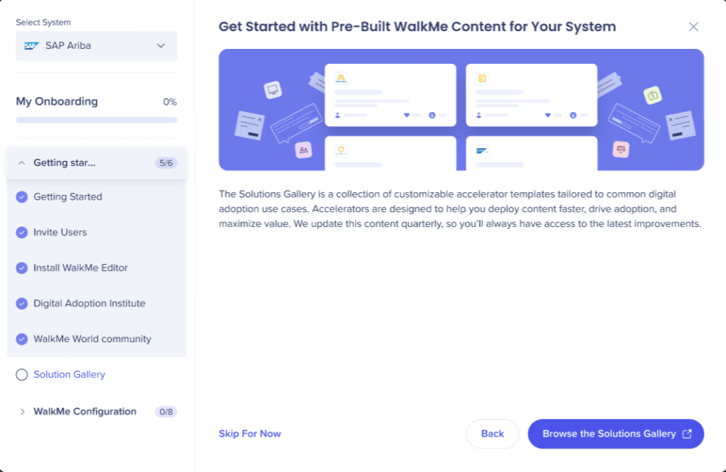 Si trabajas con sistemas SAP, tendrás acceso a la Galería de soluciones, que tiene plantillas de acelerador personalizables.
