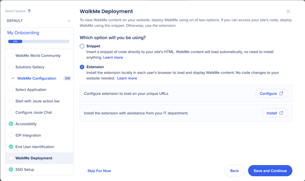 Para ver el contenido de WalkMe en tu sitio web, implementa WalkMe utilizando una de estas dos opciones. Si puedes acceder al código de tu sitio, implementa WalkMe utilizando el fragmento. De lo contrario, utiliza la extensión.
