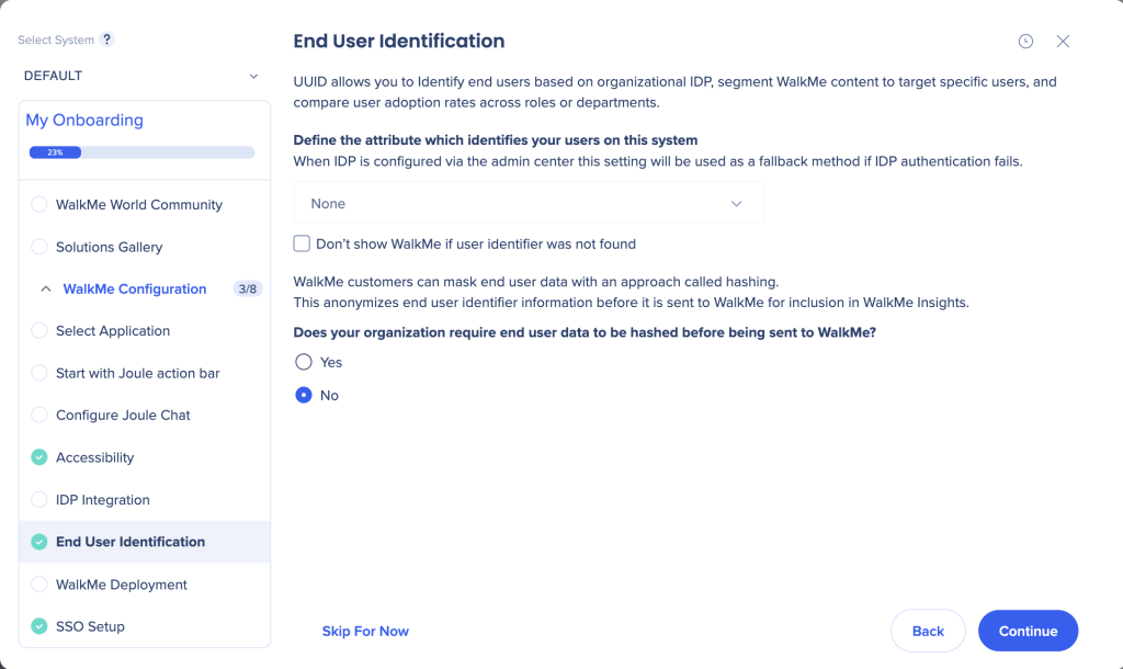 Si no configuras la integración de IDP, se te pedirá que elijas cómo WalkMe identificará a los usuarios utilizando un identificador único de usuario (UUID).