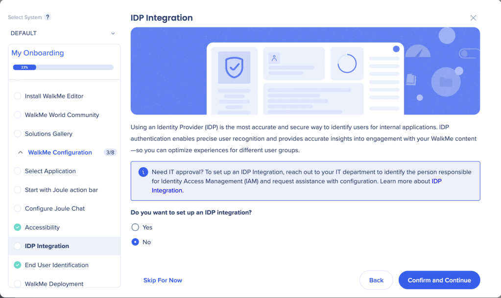 Se te preguntará si deseas configurar una integración de proveedor de identidad (IDP) para identificar a los usuarios de forma segura.