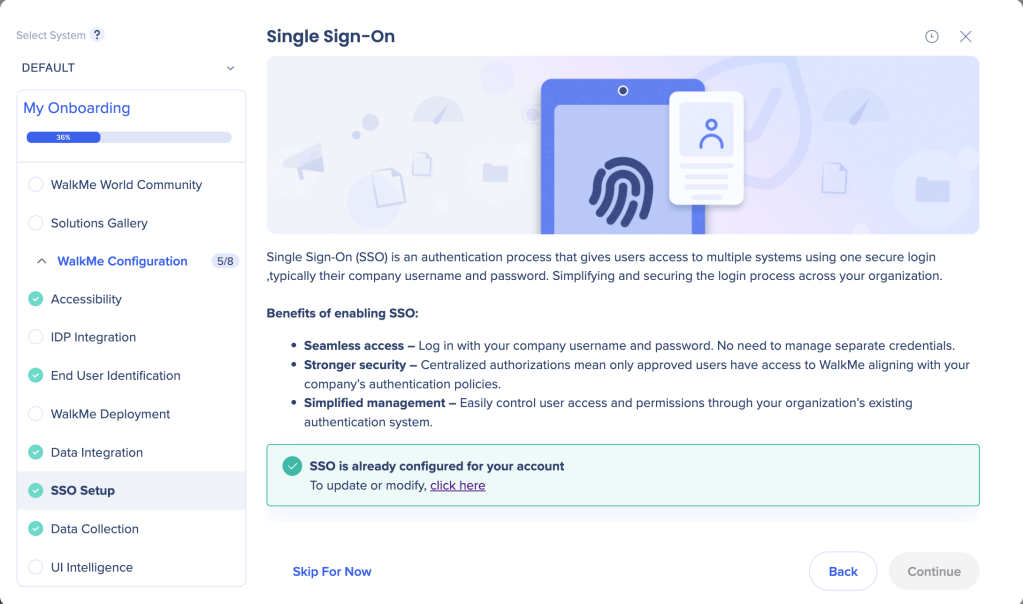 Puedes configurar el inicio de sesión único (SSO) para permitir a los usuarios iniciar sesión en WalkMe con sus credenciales existentes de la empresa. Habilitar el SSO mejora la seguridad, simplifica la gestión de usuarios y agiliza el acceso.