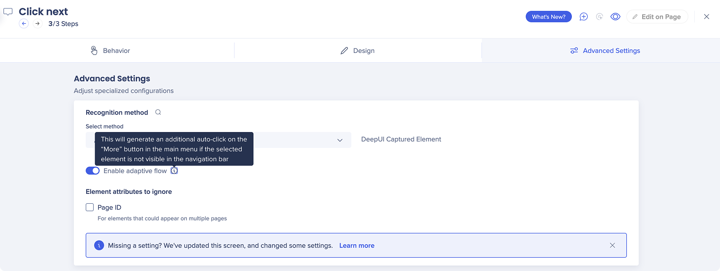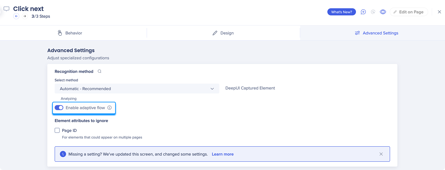 Les flux adaptatifs facilitent la construction et maintiennent Smart Walk-Thrus sur les environnements qui sont dynamiques ou ont des mises à jour fréquentes de l'interface utilisateur, du flux ou du code. Un constructeur WalkMe peut capturer un Walk-Thru normalement et le flux adaptatif vérifiera automatiquement toutes les variations de l'environnement qui pourraient affecter le flux du Walk-Thru intelligent.