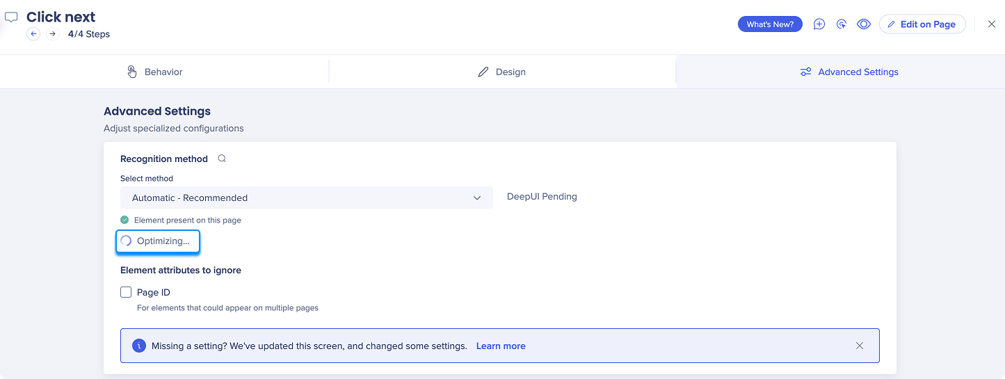 Lors de la création d'une étape de Smart Walk-Thru sur un élément pour lequel il existe un cas d'utilisation de flux adaptatif (les quatre répertoriés ci-dessus), vous verrez initialement le spinner d'optimisation dans la section de l'onglet Paramètres avancés. Cela peut prendre quelques minutes.