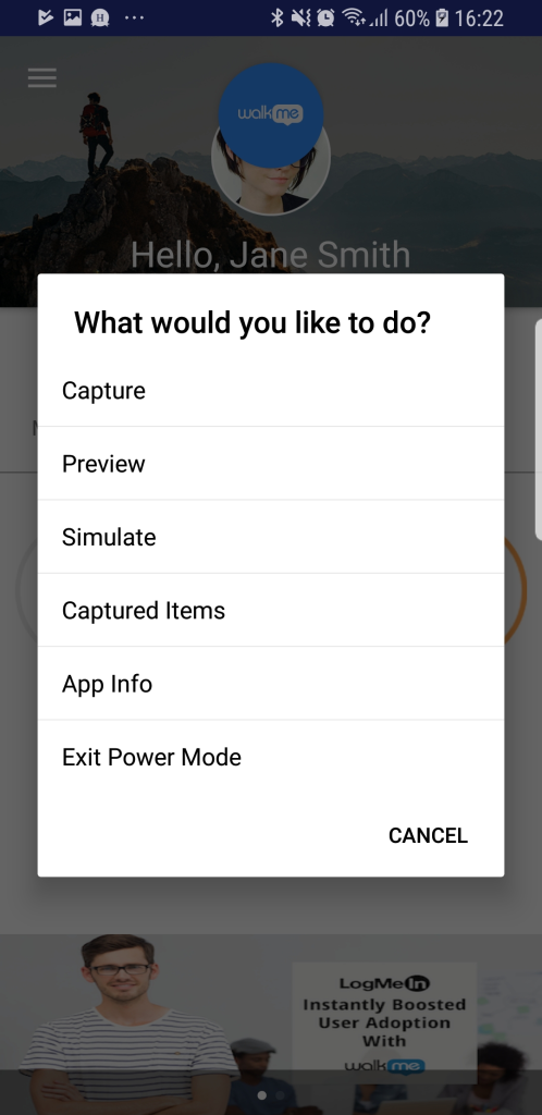 Une fois dans le mode d'alimentation WalkMe Mobile dans votre application, appuyez sur la bulle du mode d'alimentation (le cercle bleu) pour afficher le menu du mode d'alimentation :