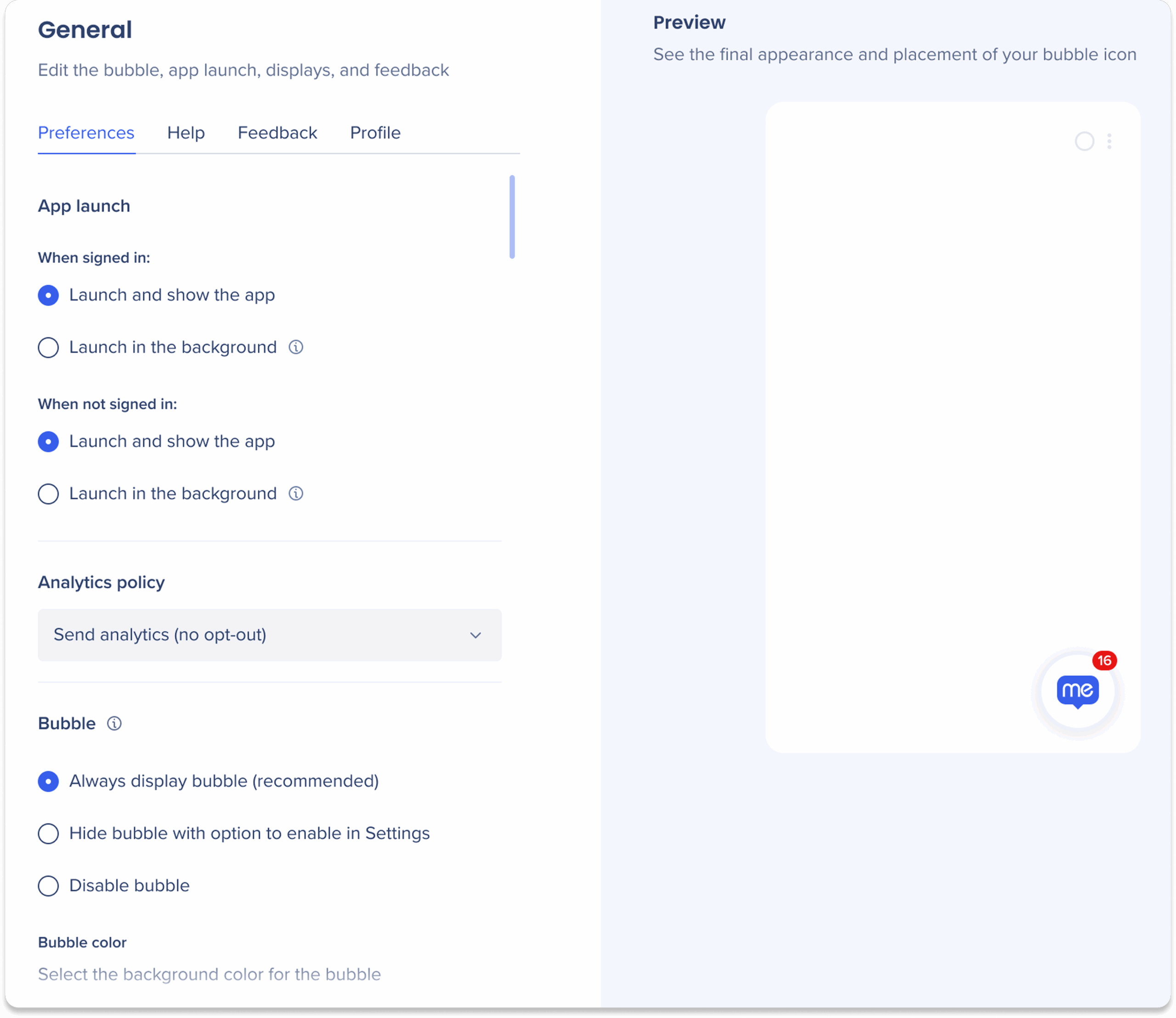 Masquer la bulle avec la possibilité de l'activer dans les paramètres : la bulle est affichée par défaut, mais les utilisateurs finaux peuvent choisir de l'activer à partir de la page Préférences dans les paramètres
